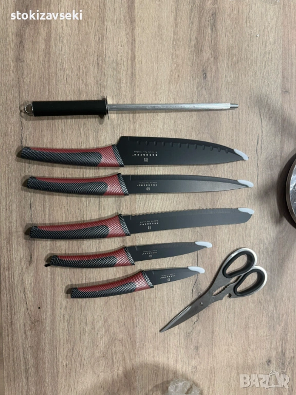 Комплектът е подходящ за ежедневно готвене – месо, зеленчуци, плодове и хляб. Стойката държи всичко подредено и на една ръка разстояние.
