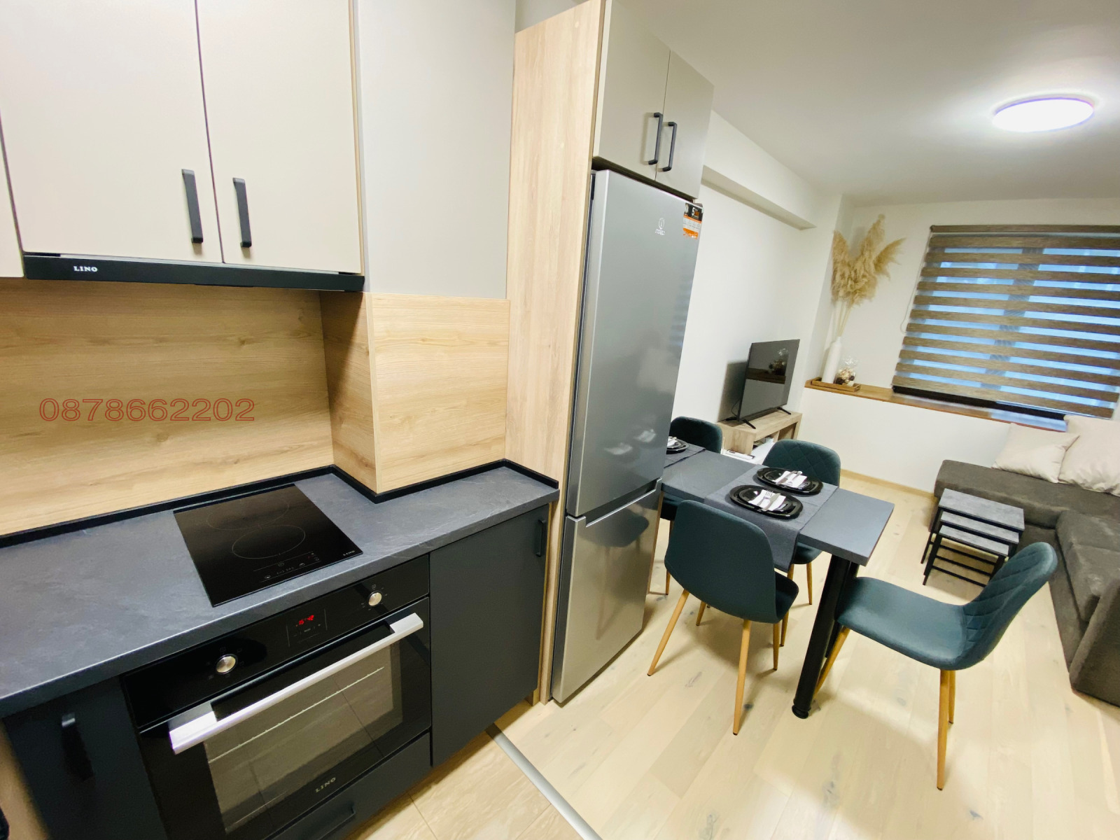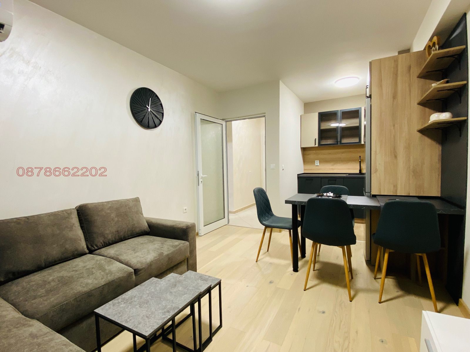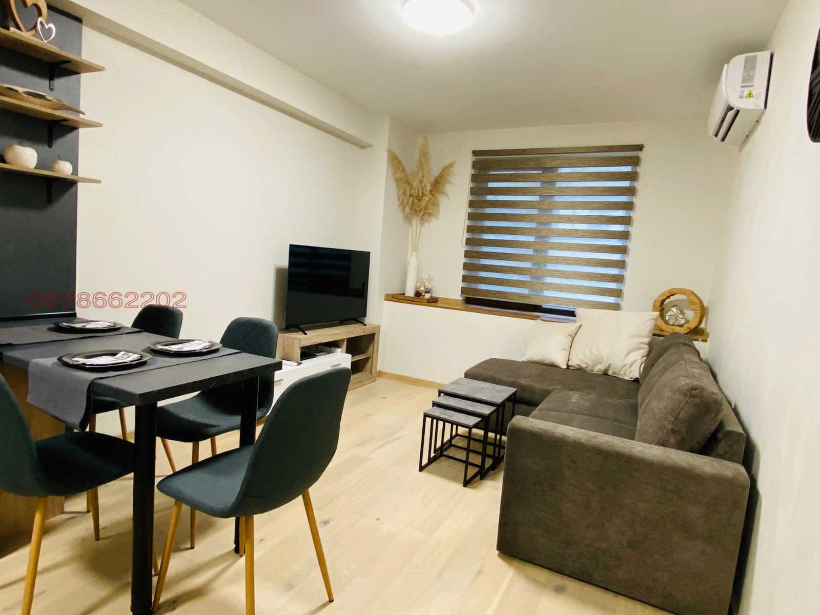 Двустаен апартамент до Музикално училище. Напълно реновиран с нова кухня, баня и мебели. Апартамента разполага с кухненски бокс, посуда, готварски принадлежности и всичко необходимо. Бокса е отворен към всекидневната, спалня, голяма баня, тераса и килер. Сградата е ново строителство с асансьор и хубави общи части.