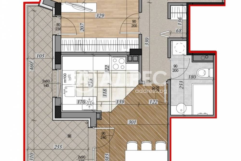 Тристаен апартамент на етаж трети с РЗП-140,50м2, ЗП-122,79м2 и разпределение: дневна с кухненски бокс и трапезария, две спални, две бани с тоалетни и разкошна тераса.