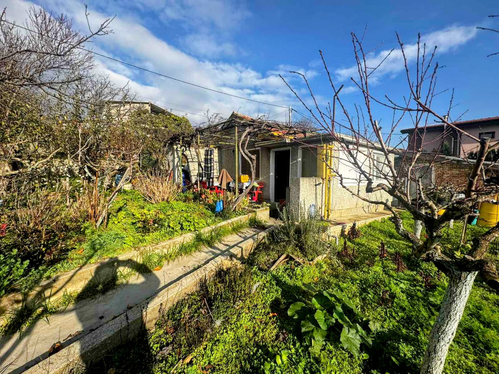 Дворът с площ от 780 кв.м предлага усещане за простор и зеленина, подходящ за семейни събирания, отдих или градинарство. В имота има овошки и лозе, които допринасят за естествената, поддържана атмосфера.