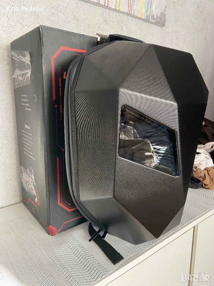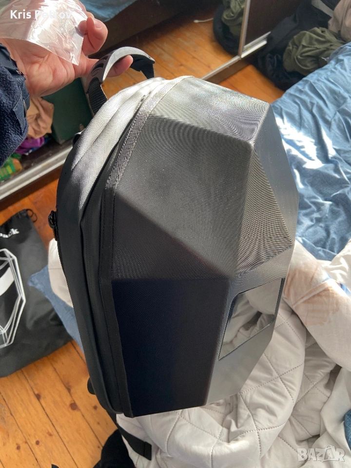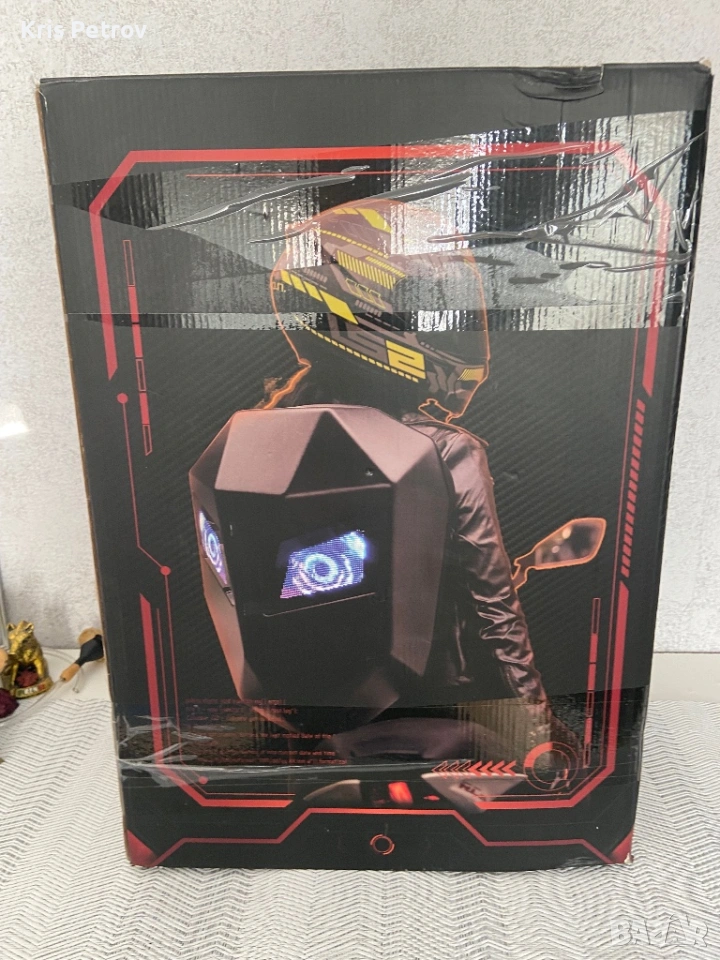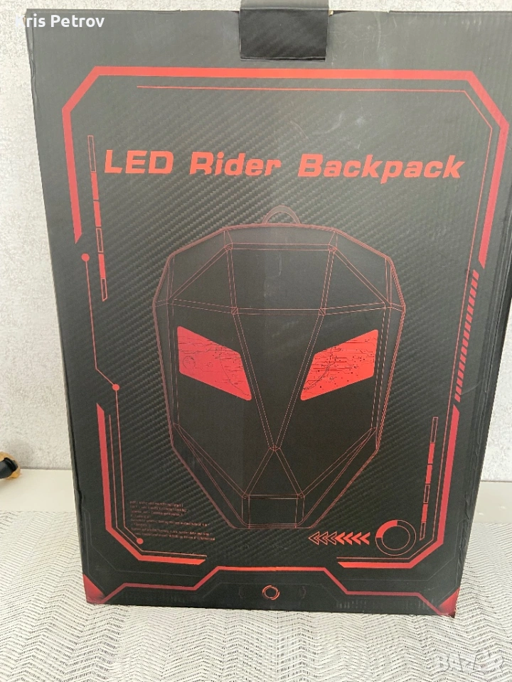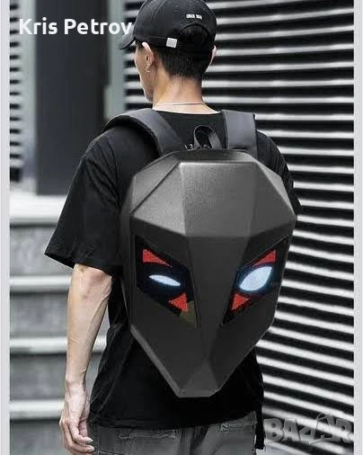 Продавам Лед мото раница.Раницата е в отлично техническо и визуално състояние.Почти неразличина от нова.Захранва се с преносима батерия Power Bank.Има два светещи лед очи на предната част.Програмируеми са и се управляват от приложение в телефона.Без проблем побира каска за втори човек.Лично предаване за град София или изпращам по куриер.