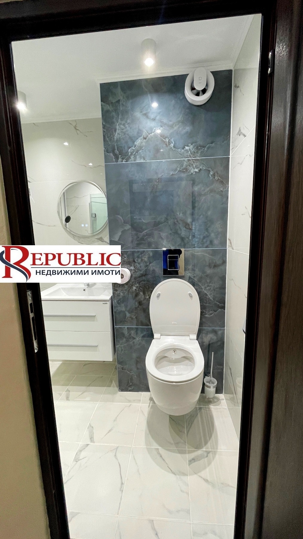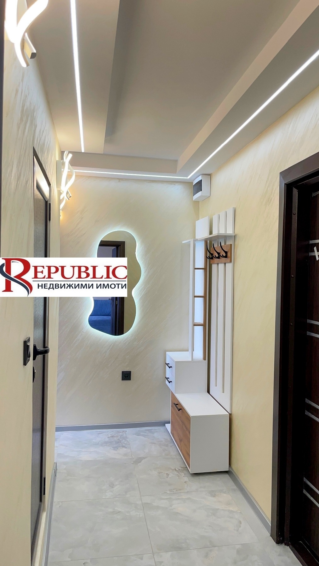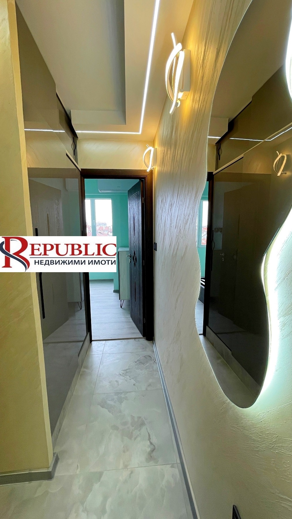 РАЗПРЕДЕЛЕНИЕ на имота: Г-образен коридор с порт-манто, ВСЕКИДНЕВНА с ВГРАДЕНА КУХНЯ И ТРАПЕЗАРИЯ, с излаз на ОСТЪКЛЕНА ТЕРАСА, с панорамна гледка и простор, ОТДЕЛНА СПАЛНЯ, с дрешник, БАНЯ И ТОАЛЕТ - общо помещение, КИЛЕР, както и прилежаща маза. Жилището е в отлично състояние, след основен ремонт, обзаведено и оборудвано. В хола и коридора подовата настилка е италиански гранитогрес, а в спалнята - ламиниран паркет. Има модерно LED осветление, включващо: два висящи LED полилея, с кристални цилиндри, скрито LED осветление, декоративно бягащо LED осветление, а към всеки телевизор са прекарани FTP и оптичен кабел, за лесно свързване към интернет и телевизия. В двете стаи са монтирани висок клас климатици Fuji Electric , със сензор за присъствие, осигуряващи ефективен комфорт през всички сезони. Санитарният възел е оборудван с висок клас смесители Grohe , вентилатор Pax и душ-кабина тип хармоника. Готов за ползване! Изложението е югоизток.