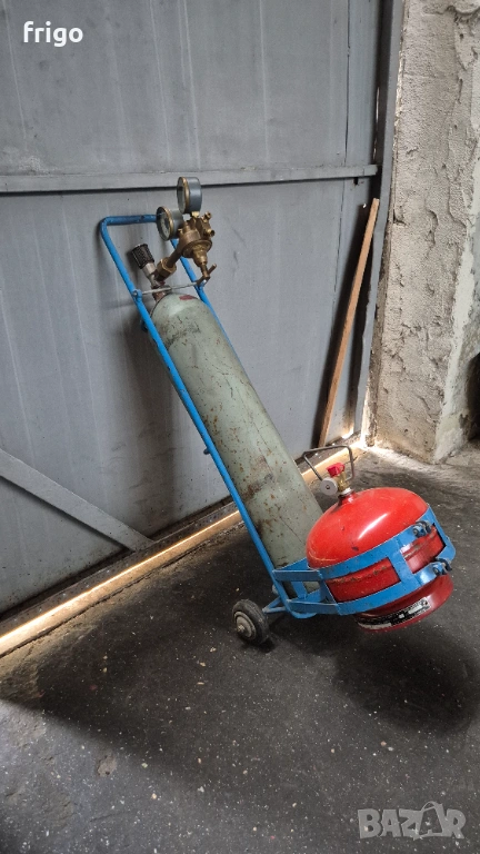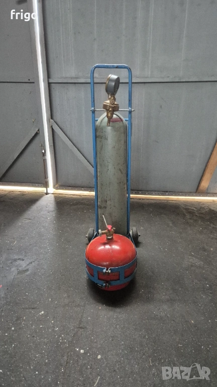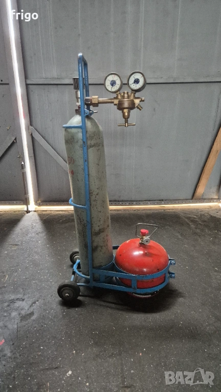 Кислородна и газова бутилка монтирани на удобна за пренасяне и работа стойка с колела . В цената е включен и редуцир вентил за кислород. В посочената цена не са включени маркучи и горелка .