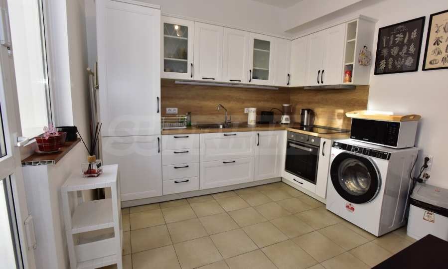 Апартаментът е светъл, тих и топъл с площ 80 кв.м. Разполага с четири самостоятелни помещения: голям хол с трапезария и френски прозорец, голяма спалня с балкон, кухня с балкон, баня-тоалетна и входно антре. Спалнята и холът са обърнати на юг-югоизток, гледат към прекрасен зелен вътрешен двор.