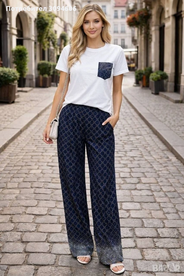 Страхотен комплект от тениска и панталон в синьо Gucci с декорация от камъни.