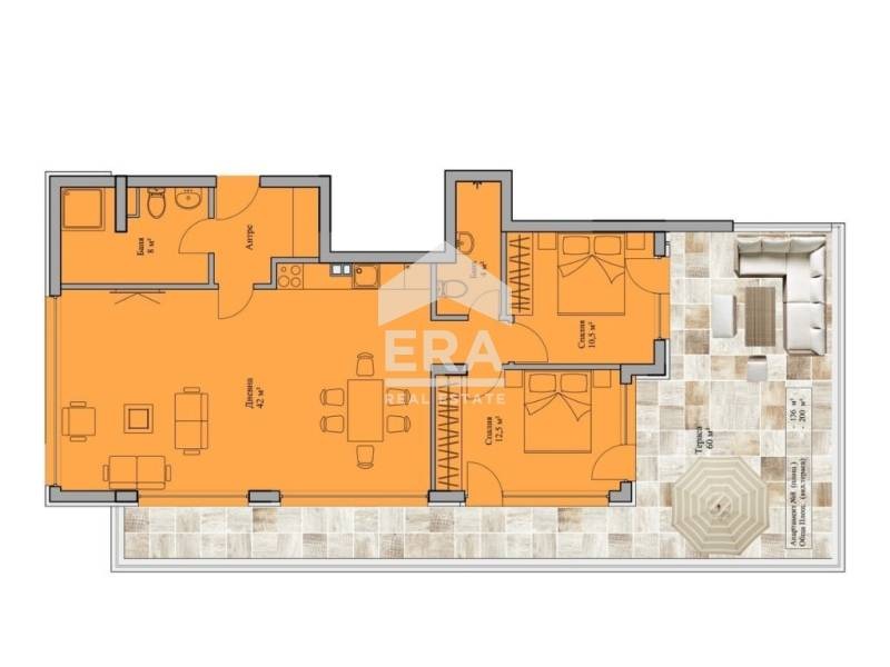 Разпределение: Входно антре, дневна с кухненски бокс и трапезария 42 кв. м., 2 спални, 2 бани с тоалетна и панорамна тераса 60 кв. м.