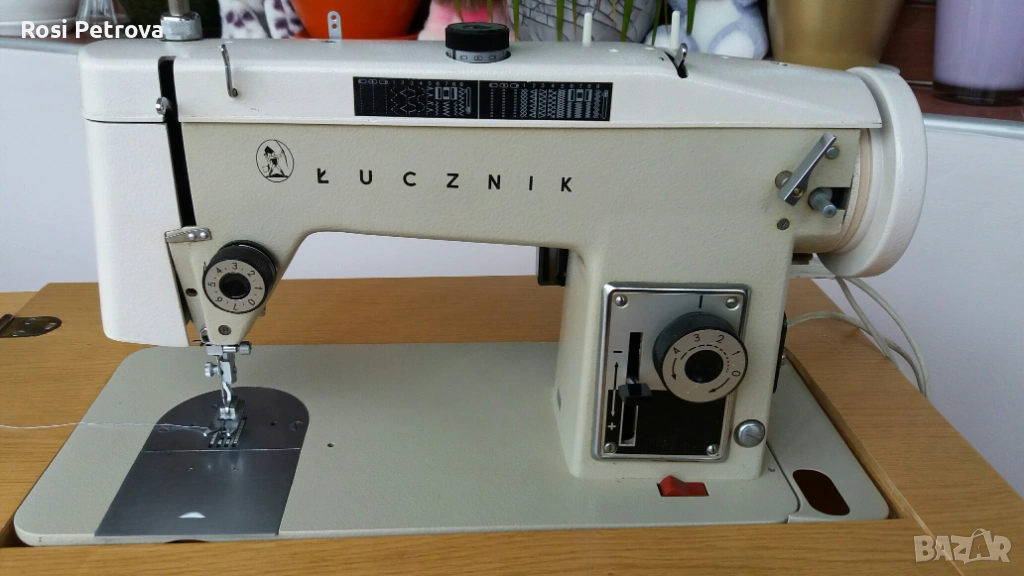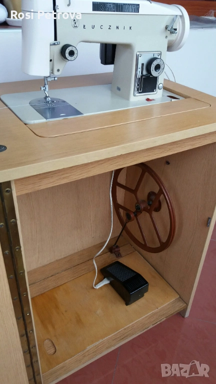 полска шевна машина Лучник 437 в отлично състояние, много добре съхранявана и в изправност. Машината е с метален корпус, вградена е в шкаф,