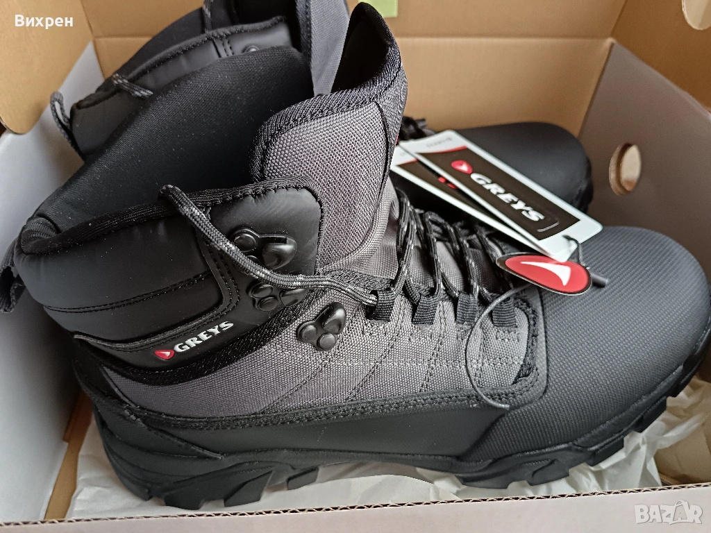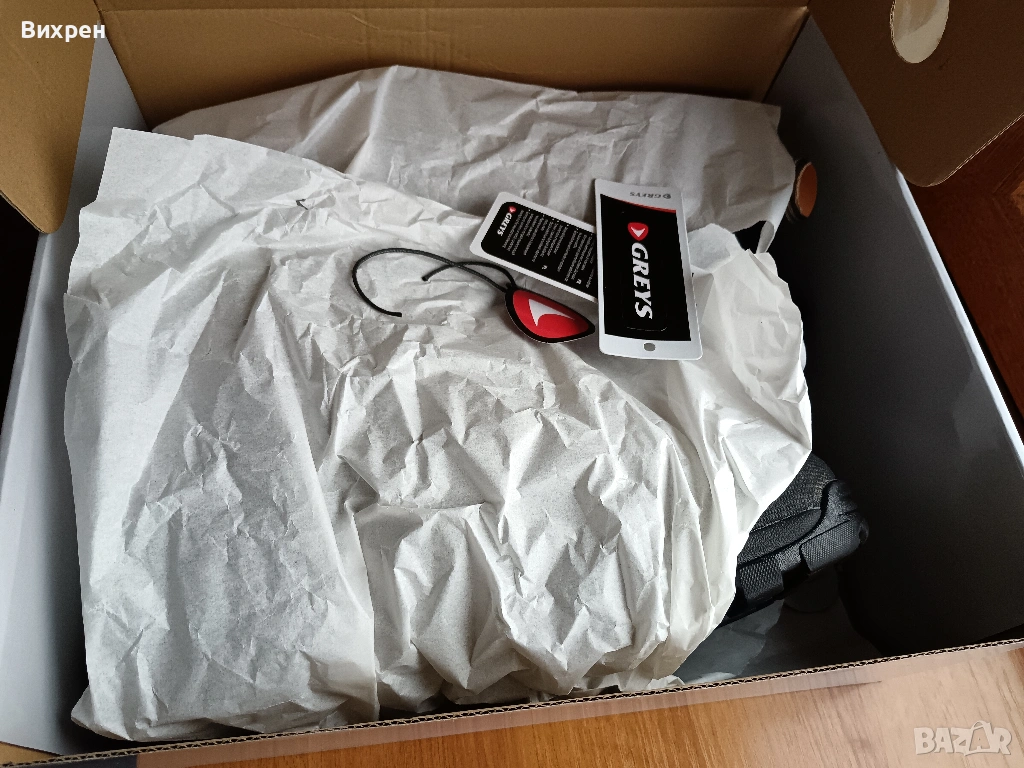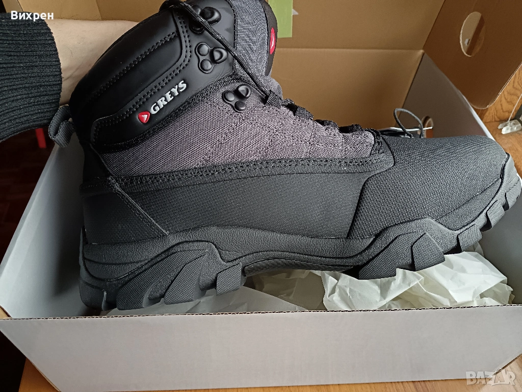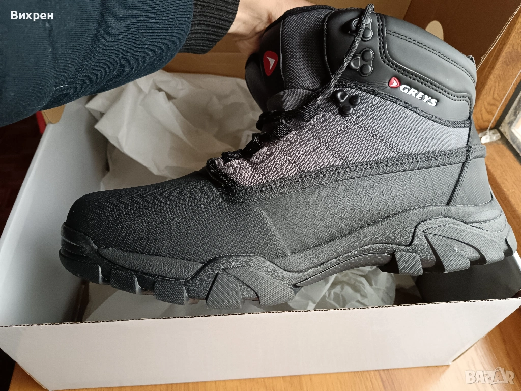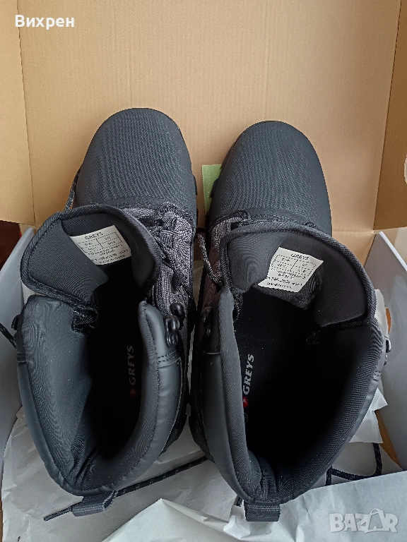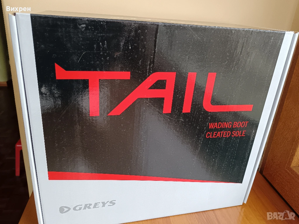 1. Обувки за газене Greys Tail Cleated Sole, 44/45. Обувани са няколко пъти със сандвич от 3 чорапа - термо, този на гащеризона и външен неопренов, като част от обувките са били покрити и от гети. Няма никакво износване, деформации и всякакви други възможни негативи - вижда се от снимките. Изсъхват напълно за 48 часа при стайна температура 15-17 градуса.