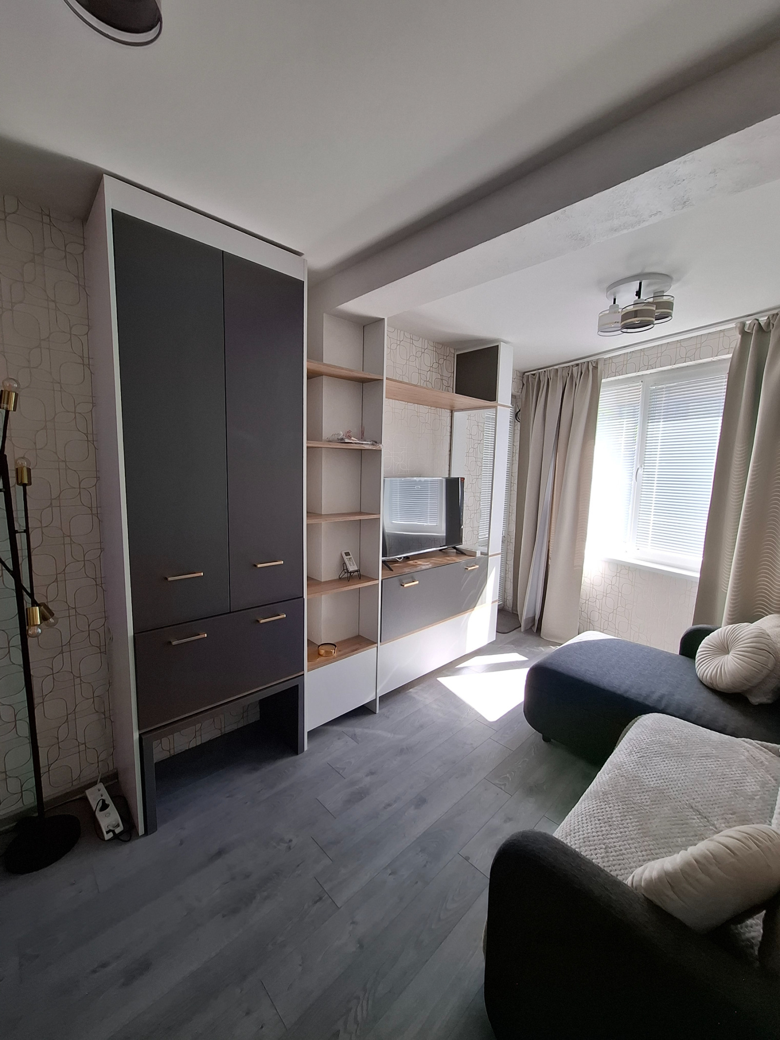 Апартамент от три помещения:кухня,хол и спалня,очаква своя първи наемател.Изключително добре мебелиран по дизайнерски проект,този уютен дом е оборудван с всичко необходимо за едно приятно пребиваване.