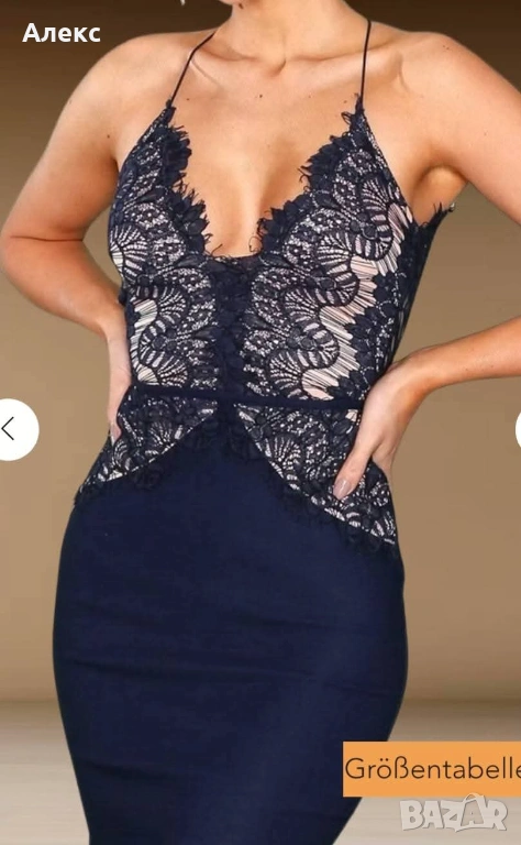Много красива рокля с дантела, тъмно синя е ,с етикет, реалната цена е доста, вижда се на едната снимка,която съм качила.