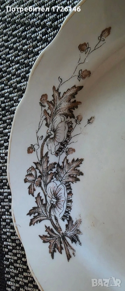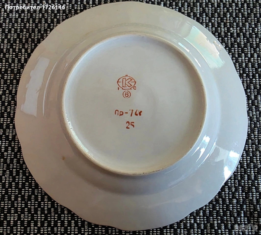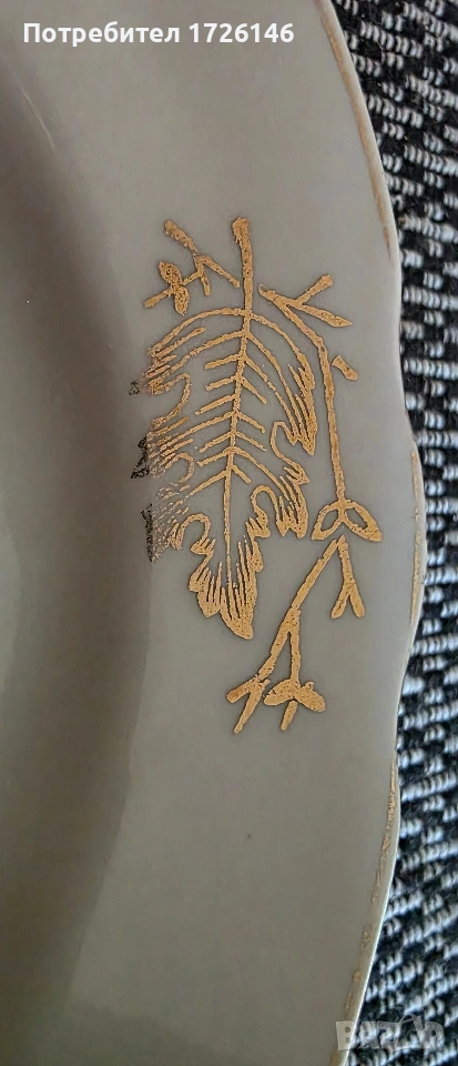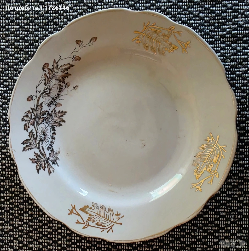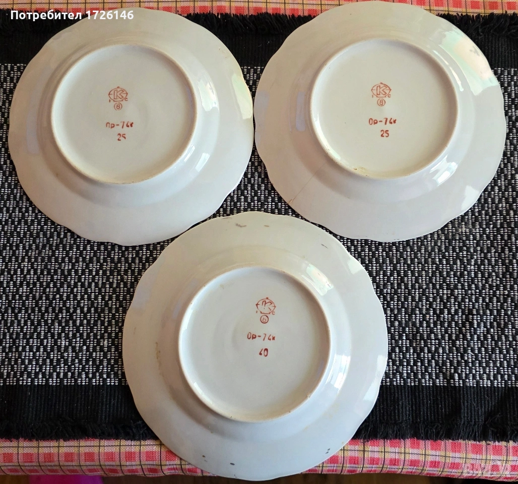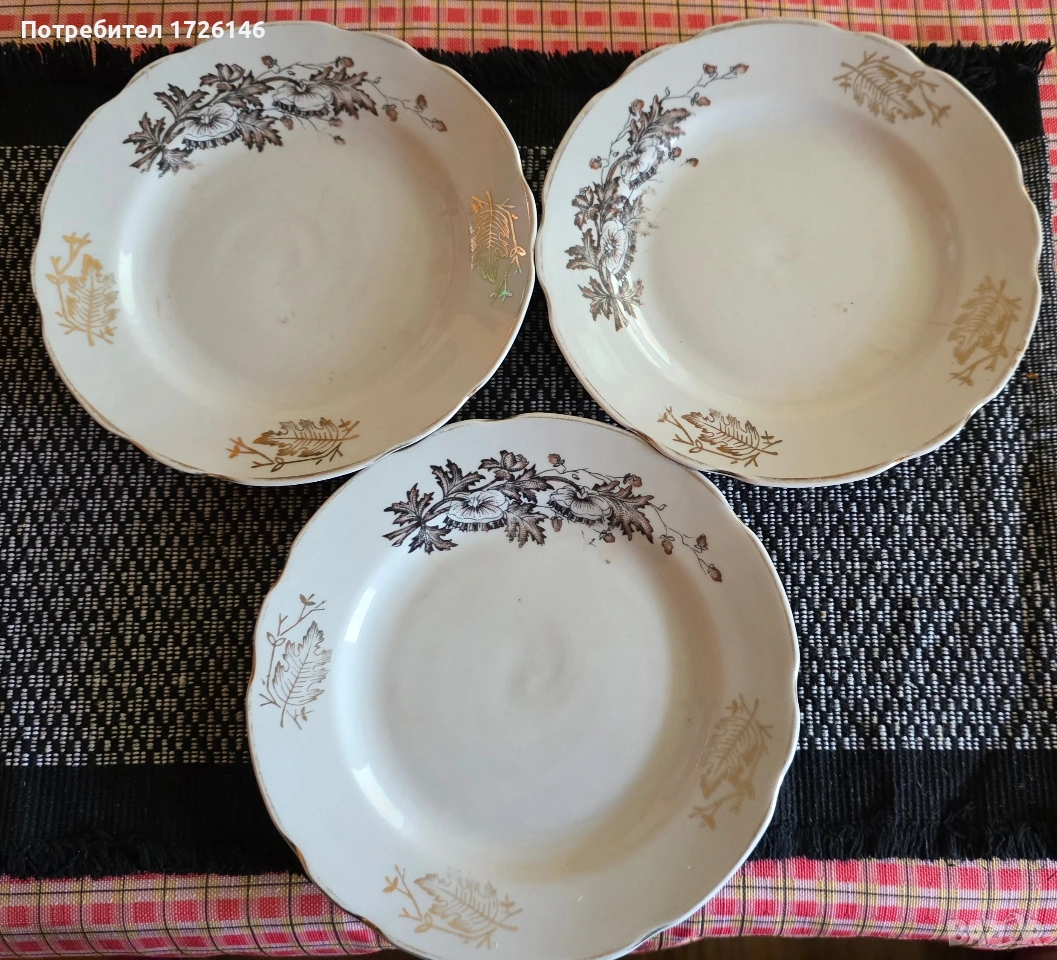 Порцеланови чинии със златен кант 3 броя на Коростенския порцеланов завод СССР, модел „Коричневый букет“. Производство между 1949-1955 година.
