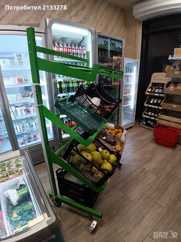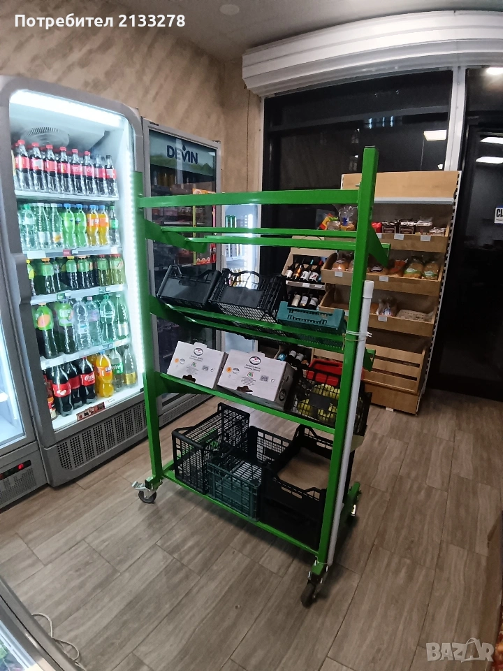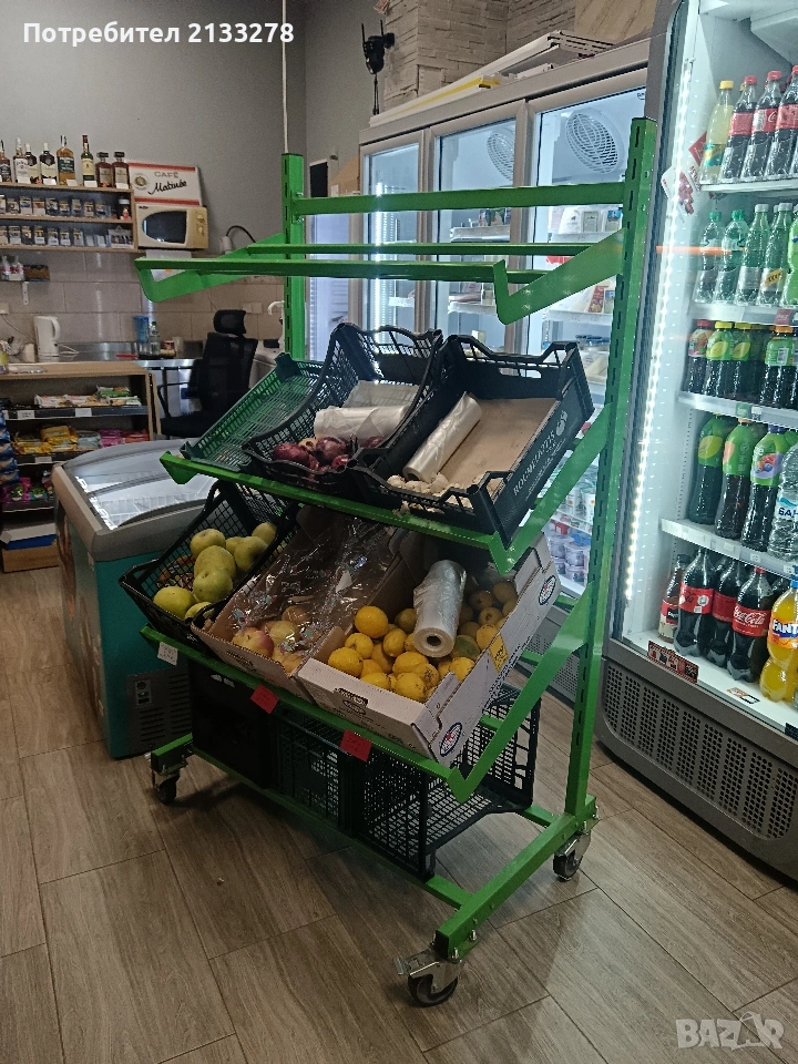 Отделно имаме и стилаж за заленчук, който е подвижен. Той дава възможност, зеленчука да се изкарва навън и лесно да се вкара вътре в магазина.