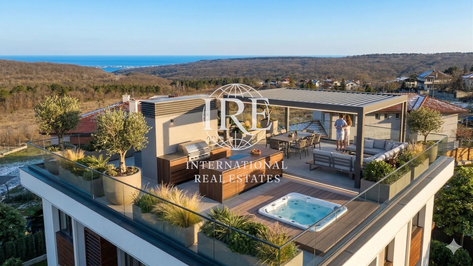 Трансформираната Покривна Тераса: [Връзка към Изображение 1: Покривна Тераса] - Илюстрира потенциала за луксозна външна лятна кухня, пергола с мека мебел, джакузи и озеленяване.