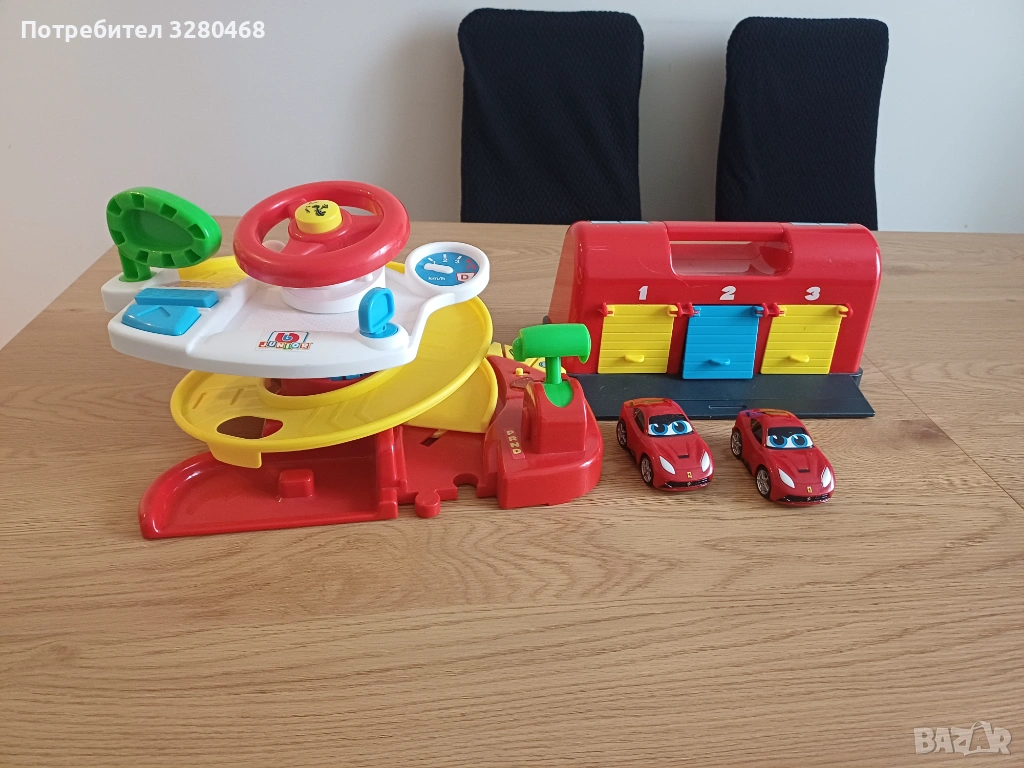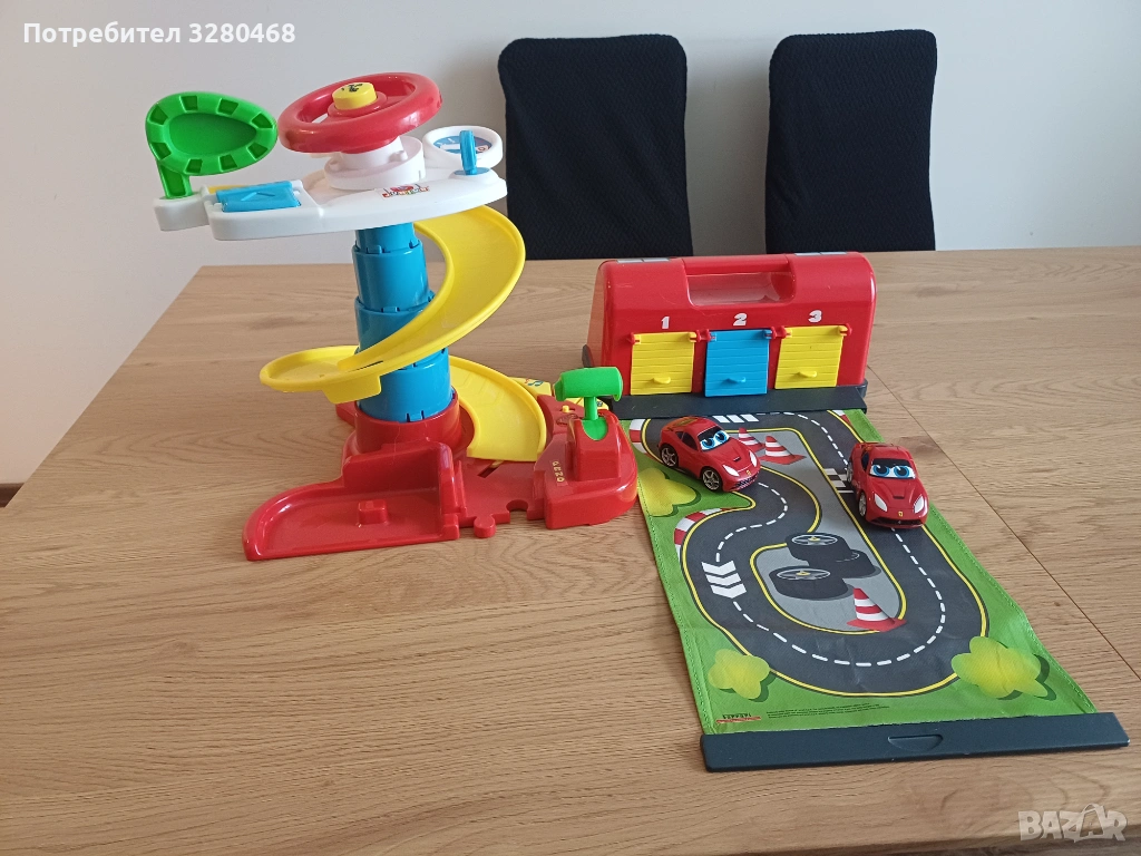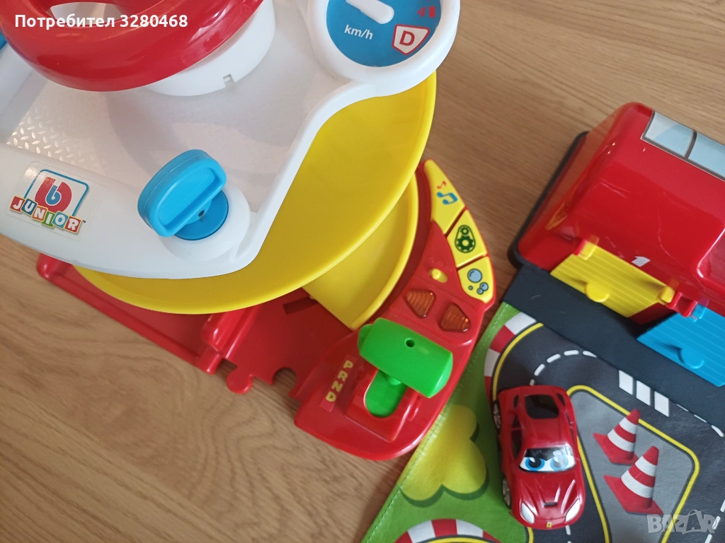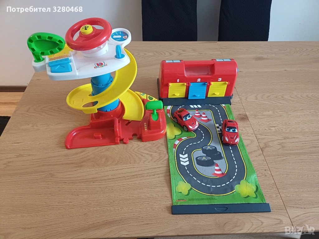 Двете играчки са в добро състояние с леки следи от употреба. Гаражът е с разтегателна писта. Кулата се опъва и ниво по ниво се застопорява със зъбци. Има звук и копче за пълно изключване. Към тях вървят две червени колички, които пасват и на двете играчки.