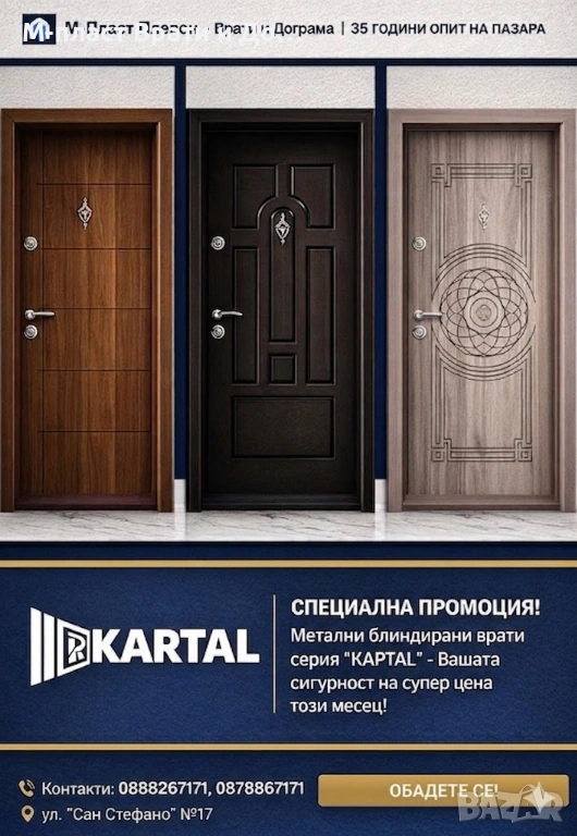 Търсите надеждна входна врата, която да съчетава масивна защита и модерен дизайн? М-Пласт представя специална промоция на серията блиндирани врати "KARTAL"!