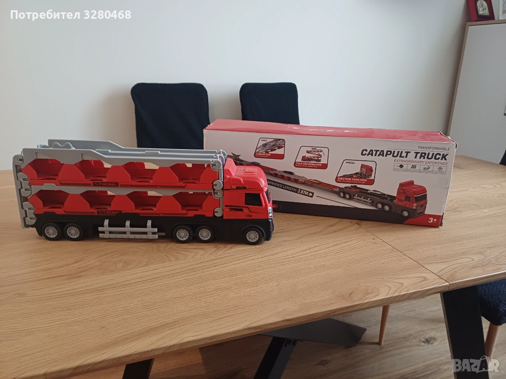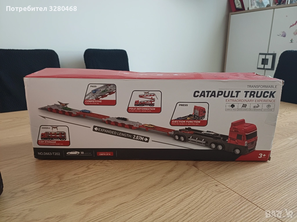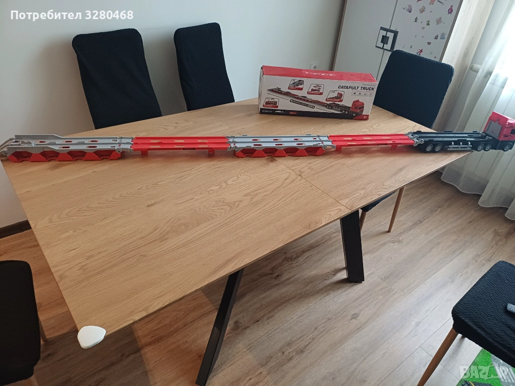 Много малко е играно с този камион. Оформя се много дълга писта, подходяща за малки колички. Върви с оригиналната си кутия, която има е с малки дефекти.