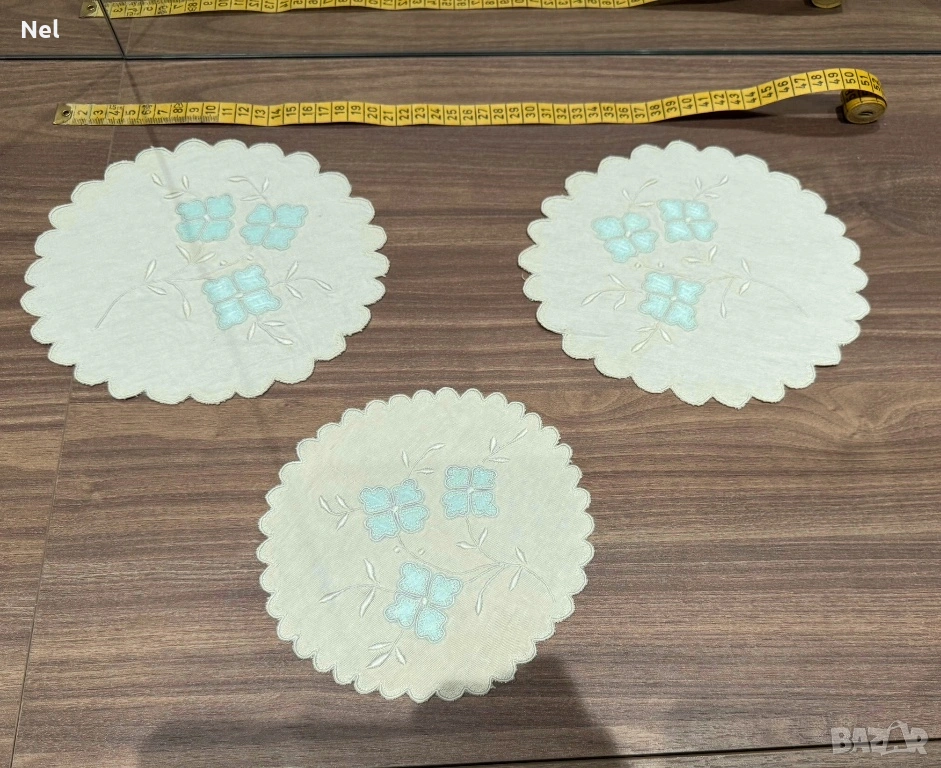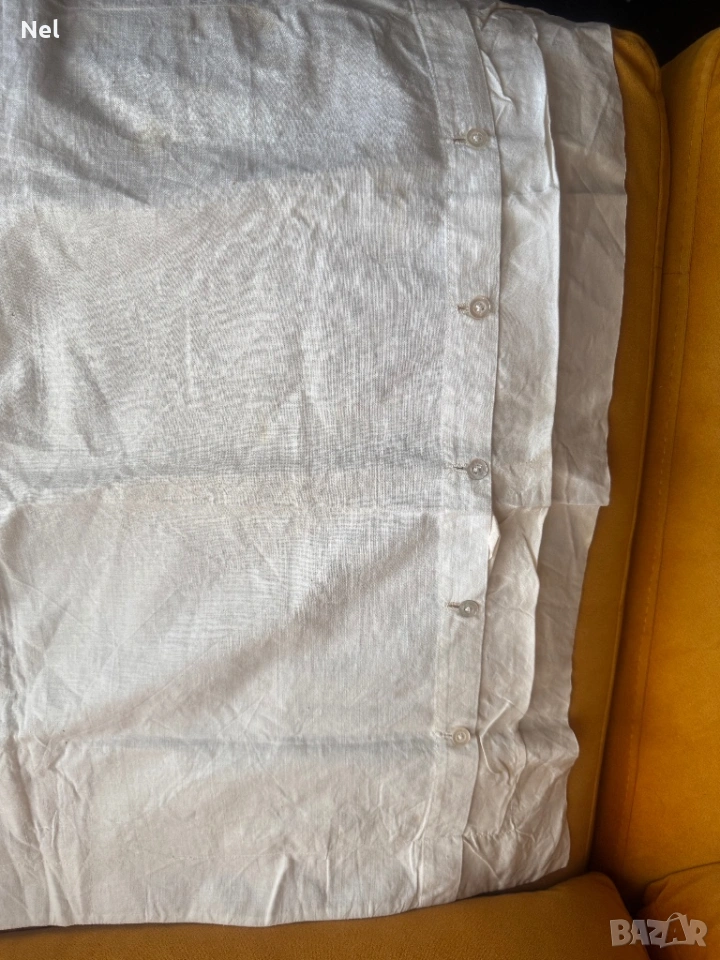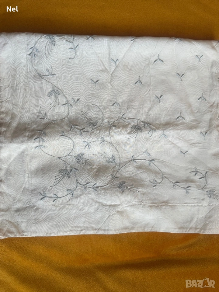 Размер между воланите -160см, ширина на волан -15см. Без забележки. Подарък- копринена калъфка с бродирани сини цветя и памучна основа.