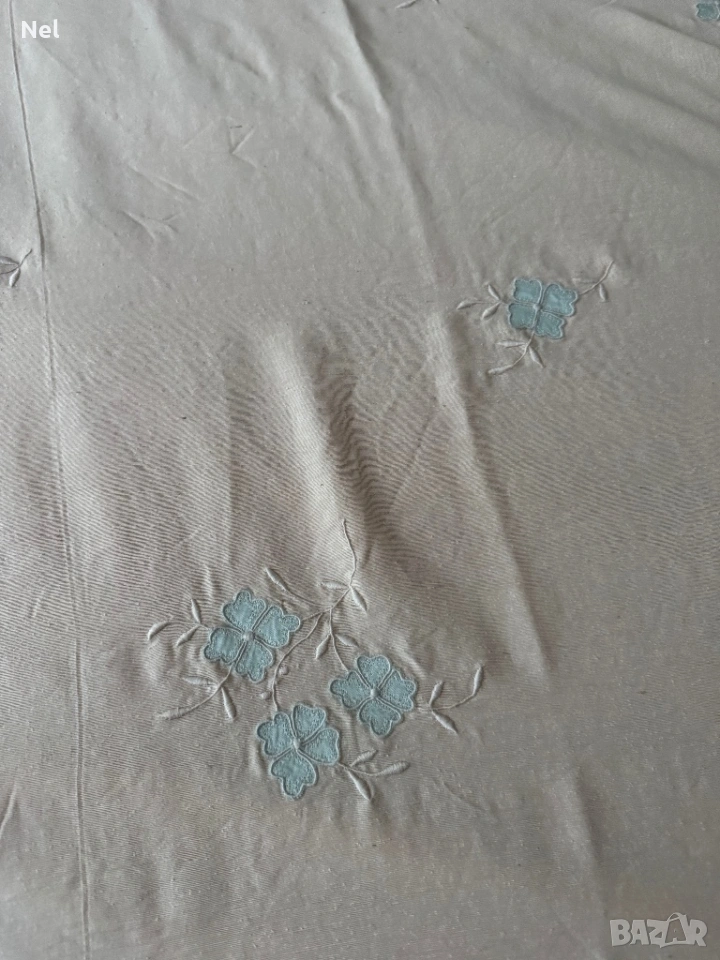 Памучна покривка за легло, с бродирани машинно сини цветя и с волани. Покривката не е използвана. Комплект с три кръгли покривчици .