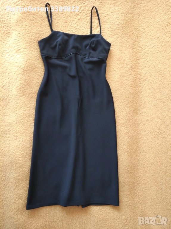 Рокля - права до коляното, тънки презрамки, на гърба се закопчава с цип, цяла дължина 104см, гръдна обиколка едностранно около 37см.