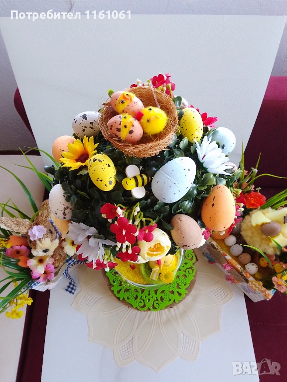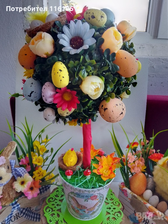 Великденско, най-новите ни аранжировки са готови, пролетни и разцъфнали специално за вас, представяме ви дръвчета във великденски кофички, използвахме зелени топчета ,цветя, яйца ,великденски пиленца
