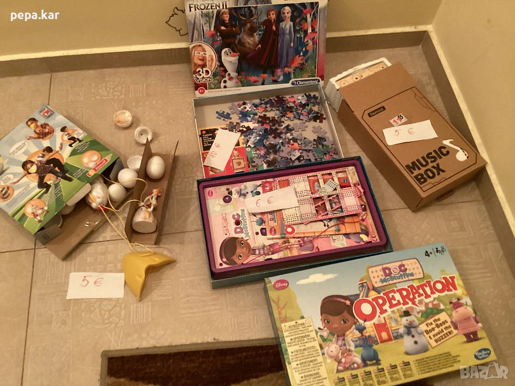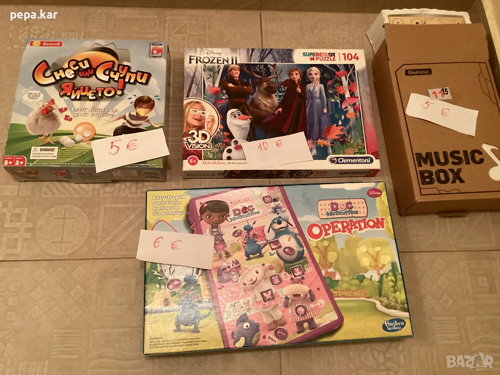 Настолни игри в отличен вид всичко,което се предлага Последните снимки всичко е по евро. Воланчето е с музика,звуци и батерия