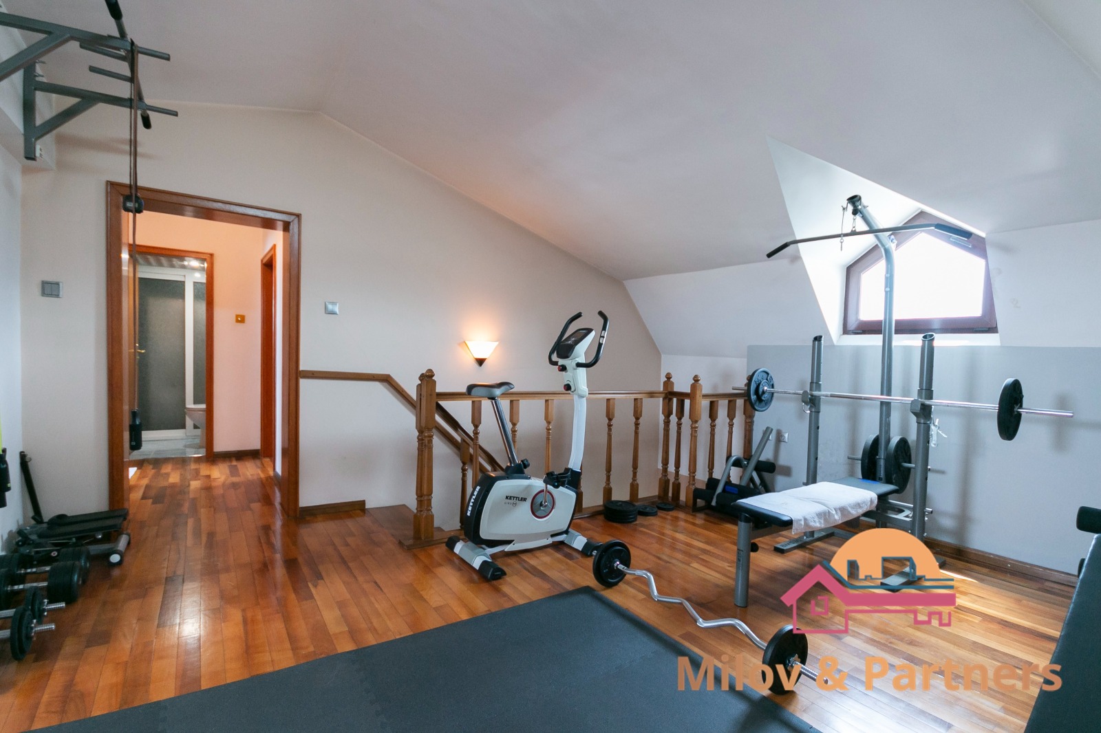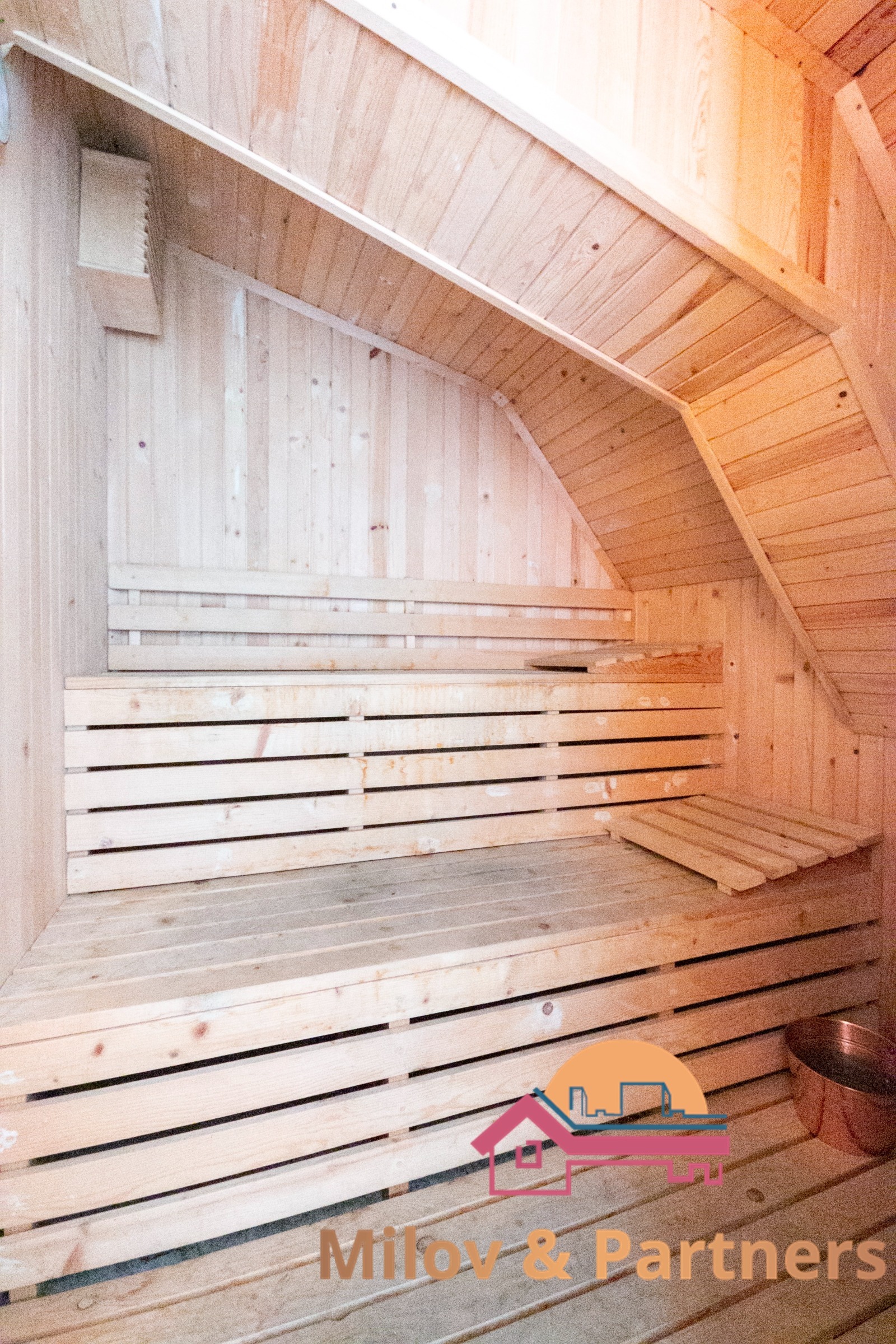 Той раполага с фитнес - кабинет , серзвизно помещение и баня и тоалетна със сауна.