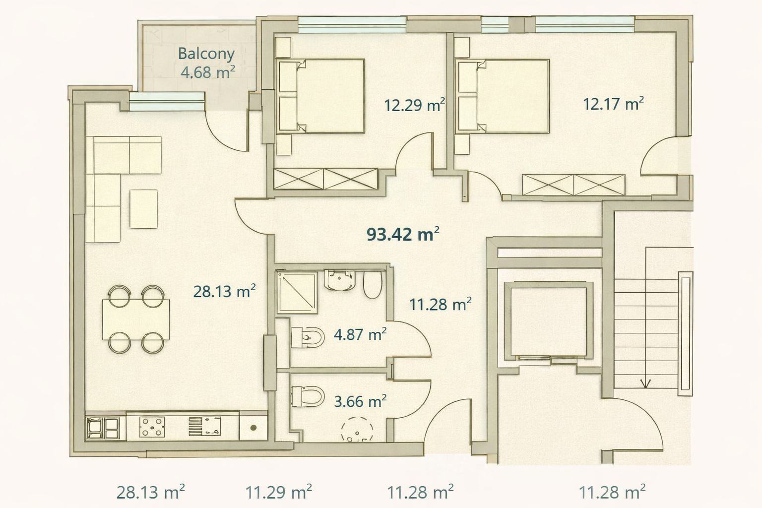 Ара Естейт предлага тристаен апартамент, състоящ се от хол с кухненски бокс, две спални, две бани с тоалетни, два балкона, мазе. Застроена площ 93,42 кв.м, обща площ 129, 09 кв.м. Разположен на 8 етаж. Акт 16 м.12.2027 г.