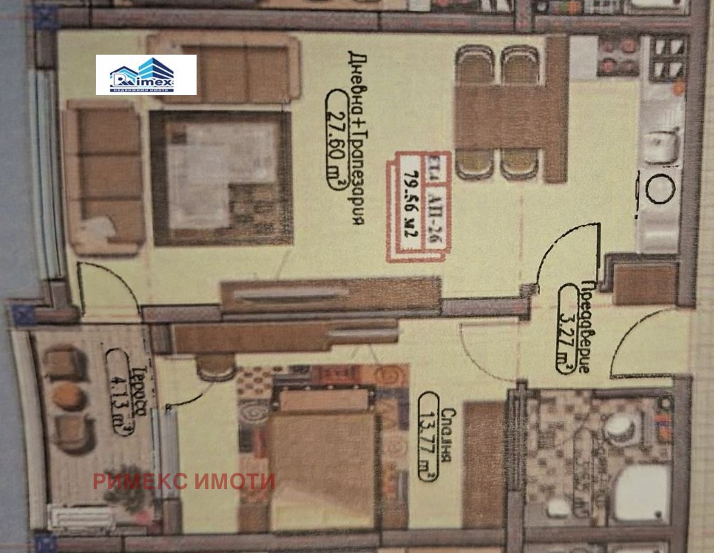 Апартаметът е на 4-ти от 6 етажа и се състои от дневна с кухненски бокс/27,60кв.м./, спалня/13,77кв.м./, баня с тоалетна и тераса.