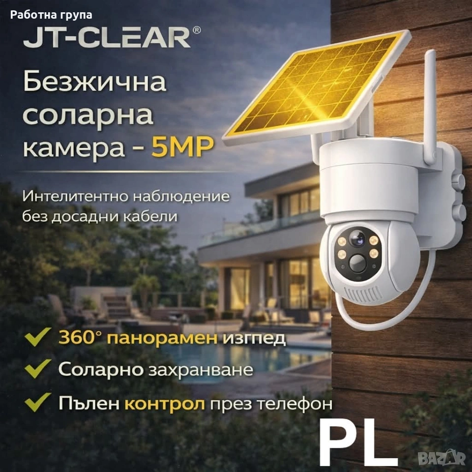 Соларна камера за видеонаблюдение JT-CLEAR 5MP, 360° панорама, PIR сензор и нощно виждане Описание: Без нужда от кабели и сложна инсталация, соларната камера JT-CLEAR 5MP предлага удобно и ефективно решение за видеонаблюдение. Захранвана от соларен панел, тя осигурява постоянна работа и независимост от електрическата мрежа. Със своя 360° панорамен обхват, камерата покрива изцяло наблюдаваното пространство, без да оставя „слепи зони“. Благодарение на 5MP резолюцията, получавате ясна и детайлна картина както през деня, така и при нощни условия. Вграденият PIR сензор реагира при движение и изпраща известия директно към вашия смартфон чрез мобилното приложение, което позволява лесен контрол от разстояние. Идеално решение за охрана на домове, дворове, вили и бизнес обекти. Сигурността никога не е била толкова лесна! Соларната камера JT-CLEAR 5MP комбинира модерна технология, автономна работа и пълен контрол – всичко, от което се нуждаеш за защита на своето пространство. ✔ 360° наблюдение без пропуски ✔ Висока резолюция 5MP ✔ Нощно виждане ✔ Соларно захранване Избери интелигентната защита още днес! Характеристики на продукта: Марка: JT-CLEAR Модел: JT-8699T Тип устройство: Соларна камера за видеонаблюдение Резолюция: 5MP Обхват на наблюдение: 360° панорамен изглед Свързаност: WiFi 2.4 GHz Захранване: Соларен панел с акумулаторна батерия Нощен режим: Инфрачервено нощно виждане Детекция на движение: PIR сензор Управление: Чрез мобилно приложение Монтаж: Външен стенен монтаж Антени: Двойни антени за по-стабилна връзка Цвят: Бял Приложение: Подходяща за външни условия Състояние:Ново Доставка до 3-4 дни с преглед и тест