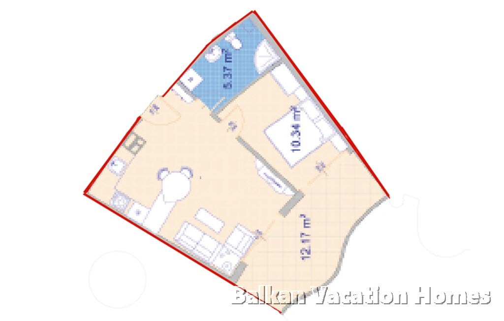 Апартаментът се намира на четвърти етаж и е с площ от 77 м². Апартаментът се състои от входно антре, хол с кухненски бокс, спалня, баня с тоалетна. От хола и спалнята има достъп до голяма тераса, откъдето можете да се насладите на релаксираща гледка към морето и околността.