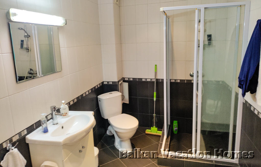 Апартаментът е с плочки на всички подове и плочки по стените в банята, климатик (отопление и охлаждане) и кухненско обзавеждане, уреди (фурна, котлон, микровълнова печка, съдомиялна машина, хладилник и вентилатор).