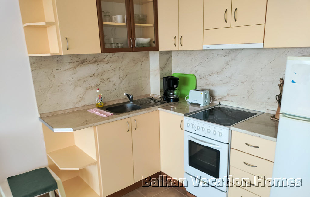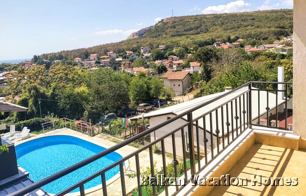 От хола и едната спалня има достъп до голям балкон, откъдето се открива невероятна гледка към зелените хълмове и Черно море. В допълнение, втората спалня също има балкон с изглед към басейна.