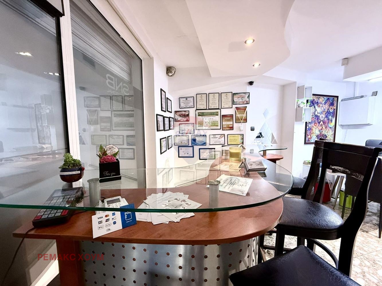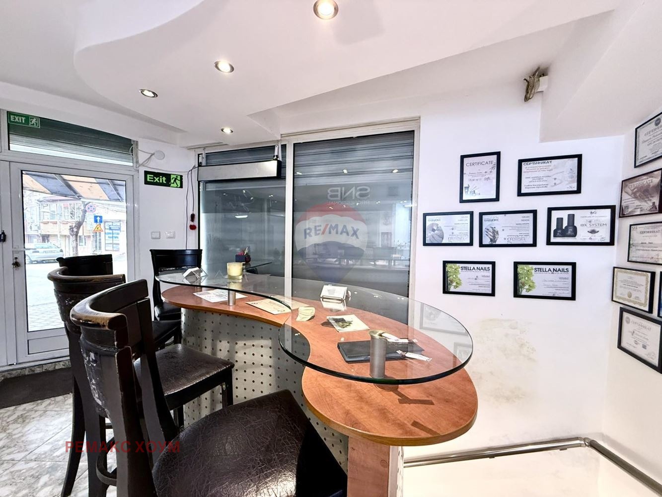 Наличието на големи стъклени витрини от прозорци тип френски с ролетни щори, които са разположени отпред по периметра на цялото помещение, осигуряват отлична експозиция и достъпа на още повече естествена светлина. Видимостта е отлична за потенциалните клиенти, което прави добра реклама. Имотът е с две лица към две улици - 3.87/ 3.09 м, ъглов е и е с излаз на много комуникативна улица с постоянен човекопоток и активно автомобилно движение. Изложението е западно. Разпределението на обекта е удобно и функционално. Отговаря на необходимите изисквания на бизнеса. Притежава нужната височина и осветеност. Височината на тавана на ниво сутерен е 2.24 м, на партера е 2.43 м. Обектът има изградени Ел.инсталация и ВиК, добра вентилационна система, осветителни тела. Отоплява се и се охлажда с климатик. Предлага се необзаведен. Има възможност да се паркира в синя зона. Наличен е и платен паркинг наблизо.