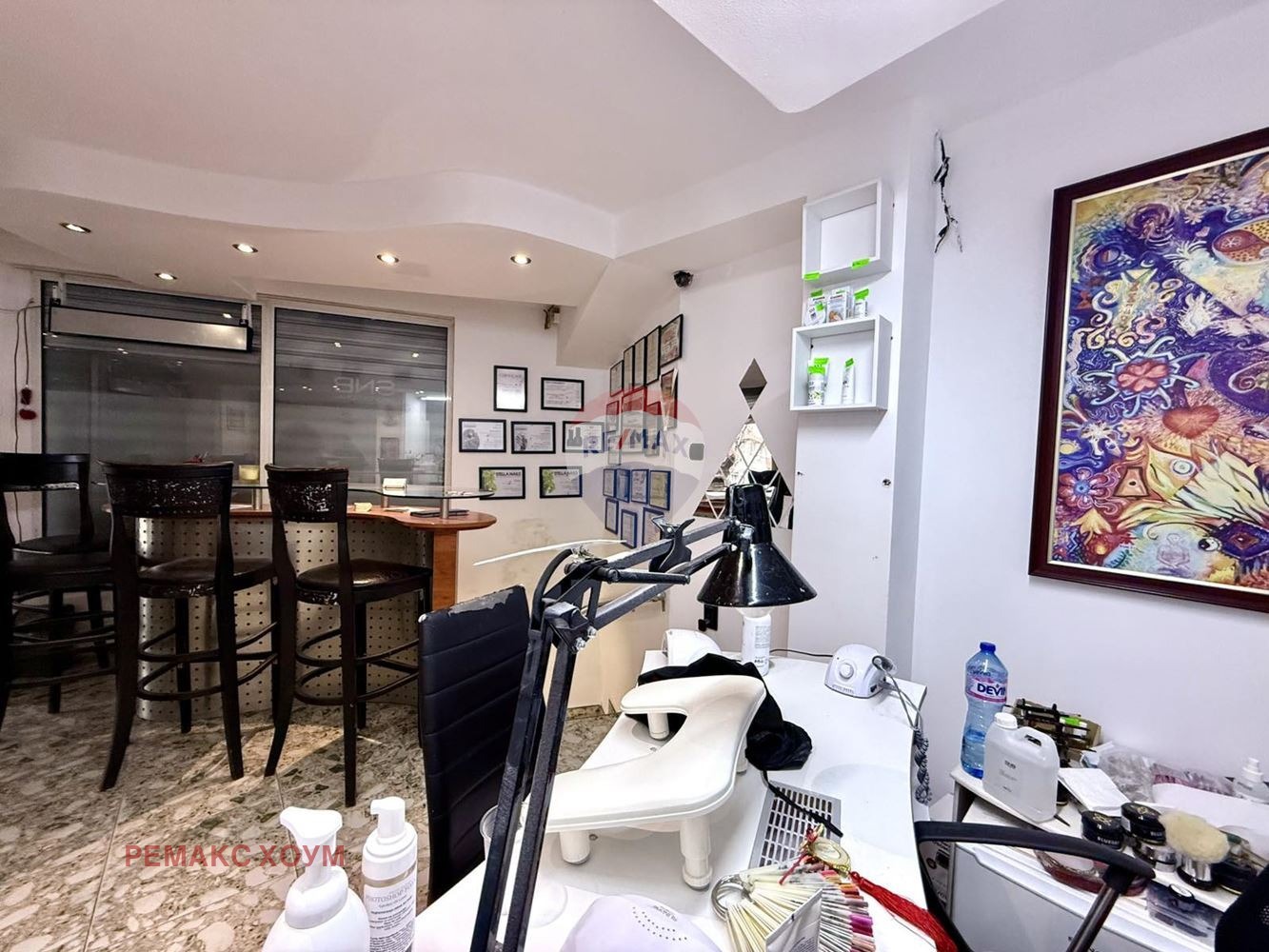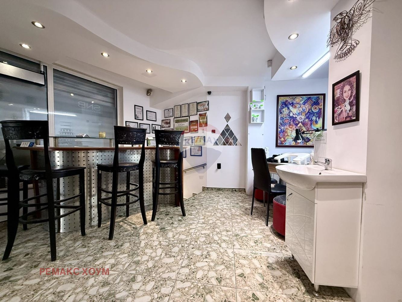 Търговската площ на първия етаж разполага с големи витрини и лице към улица. Обектът има предназначение заведение със статут кафе-аперитив - търговски обект, подходящ за сервиране на топли/студени напитки и алкохол /аперитиви, често с лека кухня. За последно е функционирал като кафе бар, студио за красота. Може да се използва за различна търговска дейност - естетичен център или салон за красота, студио, заведение за развлечения, салон, магазин, офис, заведение, ресторант за бързо хранене и друг тип търговска дейност, и услуги. Капацитетът съчетава открита и закрита част на помещението.