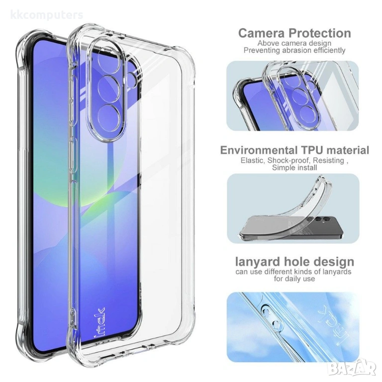 IMAK е прозрачен защитен калъф за Samsung Galaxy A37 5G, който съчетава кристална чистота с надеждна защита. Изработен от екологичен, еластичен и шокопоглъщащ TPU материал, този калъф осигурява гъвкаво прилягане и лесен монтаж. Големите въздушни възглавници в четирите ъгъла ефективно разсейват енергията при падане, предлагайки превъзходна шокоустойчивост. Повдигнатите ръбове около камерата и екрана предпазват най-чувствителните зони от надраскване. Отворът за ремък (ланйард) позволява закачане на различни видове ремъци за удобно пренасяне. Комплектът включва скрийн протектор за цялостна защита на екрана.