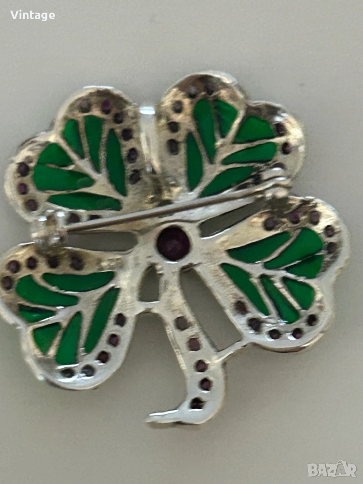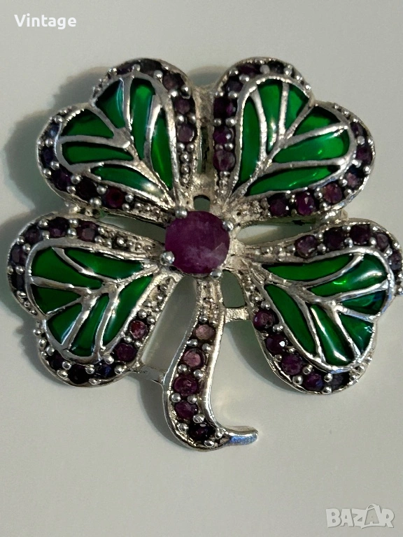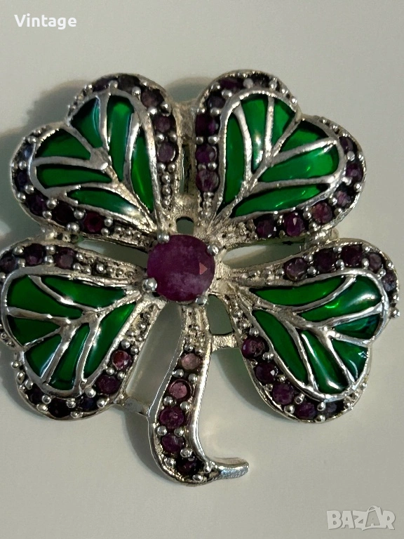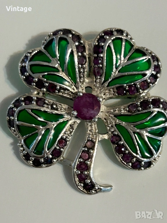 Старинна уникална сребърна брошка/ медальон с естествени рубини и зелен емайл. Бижуто може да се носи като брошка и като медальон. Размер 3,5см/3см. маркиран , тегло 6,62гр. Изключително красив в отлично състояние.