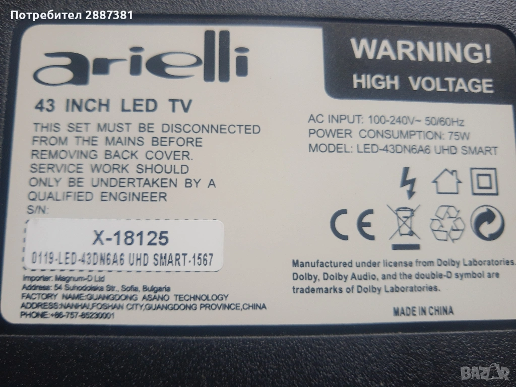 ARIELLI 43DN6A6 UHD на части LD.M538.A PW.75W2.801 HV430/550QUB-N4D → Обява 54053689