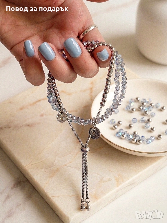 🤍 Стилен сет гривни, който включва една регулируема гривна от неръждаема стомана и две с блестящи фасетирани мъниста.