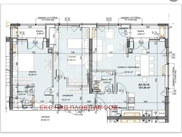 РАЗПРЕДЕЛЕНИЕ: Жилището разполага с площ от 140 кв.м, разгърната в следното функционално разпределение: входно антре, хол с кухненски бокс, две спални, две бани с тоалетни.