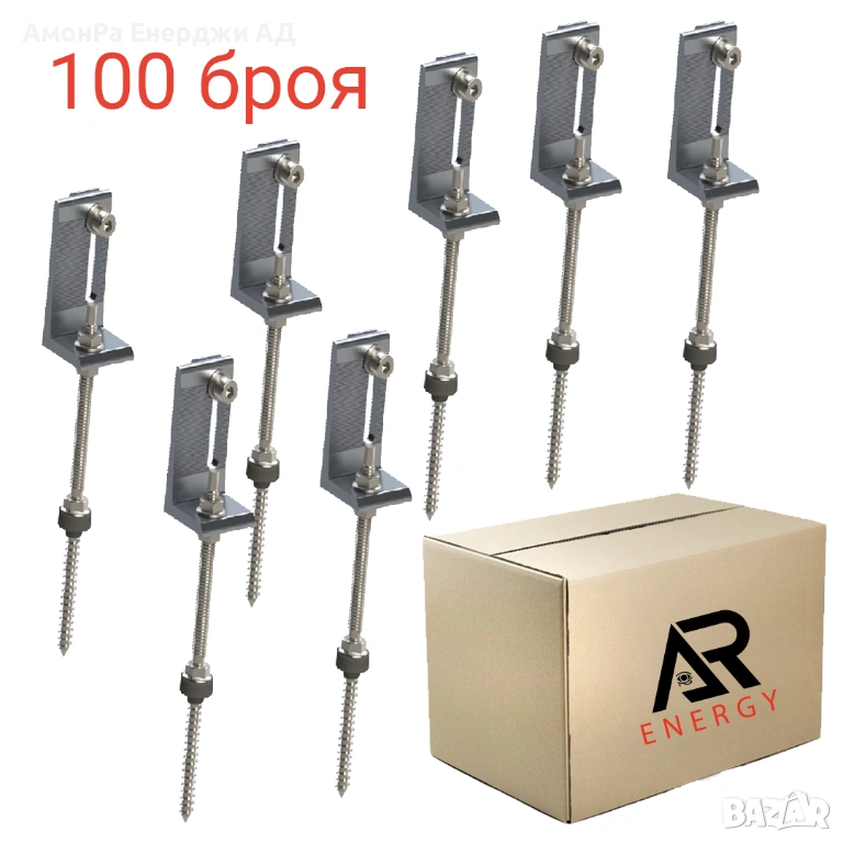 AR2 Винт Шпилка с L-образна планка + шайба, 250мм за закрепване върху изградена покривна конструкция. Може да се закрепва върху дървени греди или върху бетонова повърхност. За закрепва върху бетонова повърхност е необходимо предварително да се пробие с един размер по-малка дупка. Съвместим с профил R06 – профил със страничен канал.