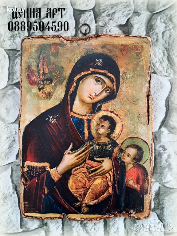 Иконата е ръчна изработка на "Ценна Арт", техника декупаж върху дървена дъска. Дорисувана е ръчно с акрилни бои, състарена и запечатана с восъчна вакса