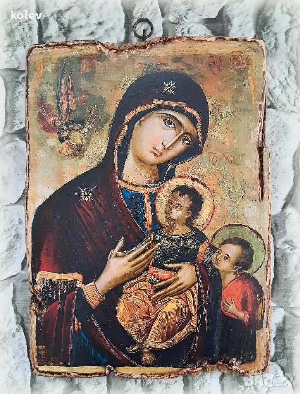 Ръчно изработена икона на Богородица с Младенеца Христос и св. Йоан Кръстител.