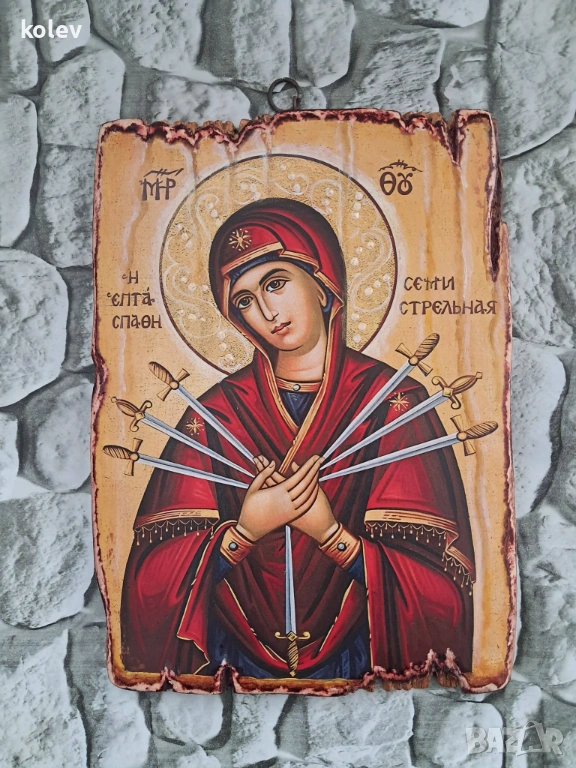 Репродукция на Чудотворната икона на Света Богородица Седмострелна - предпазва от магии и уроки, защитава от завист, злоба и недоброжелателни помисли, прогонва злите духове. Иконата е позната още с наименованията си "Богородица със седемте стрели" и „Успокоение на злите сърца”. На изображанието Божията майка е изобразена със стрели символизиращи страданията на Исус Христос и от друга страна всички човешки пороци и раздори, които пронизват сърцето на Небесната Майка, като предизвикват състрадание и молитва. Иконата предпазва от от магии, пази от негативни мисли и предава нуждата на душата от милосърдие и търпимост. Молитви се отправят за защита при вражди, за помирение при възникнали семейни, съседски или работни спорове, за подобряване на отношения между роднини, близки и родители и деца, а също и за цялостно смирение, състардание и милосърдие. С молби към иконата на Света Богородица Седмострелна се прибягва и при враждуващи държави, с молба за защита от нападения и надежда за смекчаване на злите сърца. Пред иконата се молим за изцеление от телесни или душевни болести, семейно благополучие и щастие.