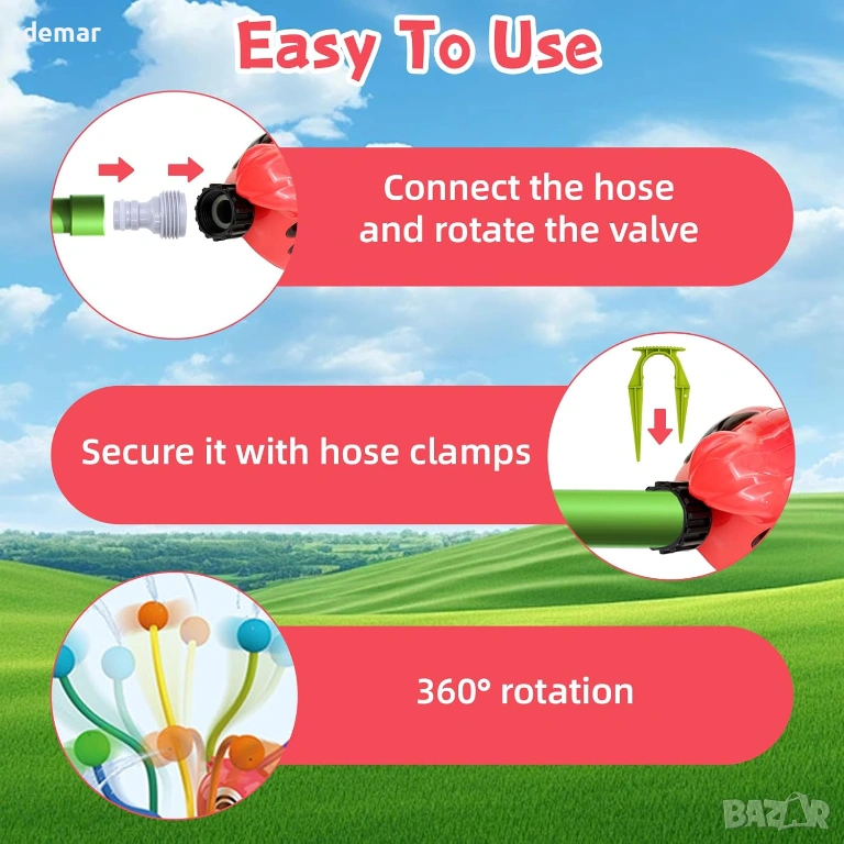 Тази детска играчка - водна пръскачка се отличава със забавен, привличащ вниманието дизайн с ярки цветове и игрива форма, която бързо привлича вниманието, а меката ѝ, екологична ABS конструкция гарантира издръжливост, гладки ръбове и безопасна употреба както за деца, така и за домашни любимци. Тя произвежда широки, динамични водни струи през множество гъвкави люлеещи се отвори, създавайки ангажиращо и интерактивно изживяване при игра, подходящо за самостоятелна или семейна употреба. Пръскачката се свързва със стандартен градински маркуч без нужда от батерии, което позволява бърза настройка и регулируема височина на пръскане чрез водното налягане, и може лесно да се разглоби за компактно съхранение. Подходяща както за вътрешна, така и за външна среда, като градини, басейни, паркове или бани, тя осигурява разнообразно водно забавление през различните сезони.