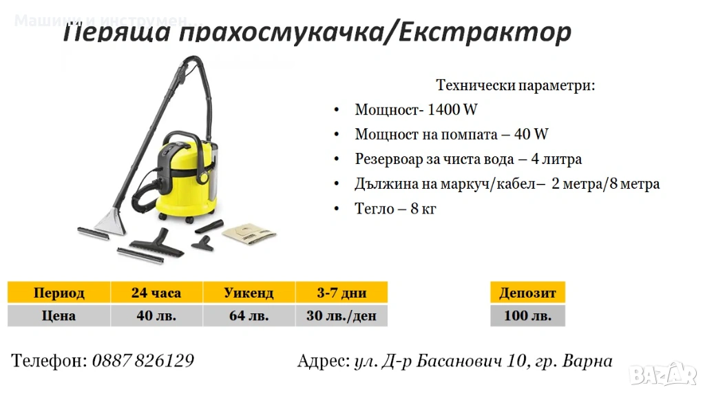 Перяща прахосмукачка/ Екстрактор под наем → Обява 54055137