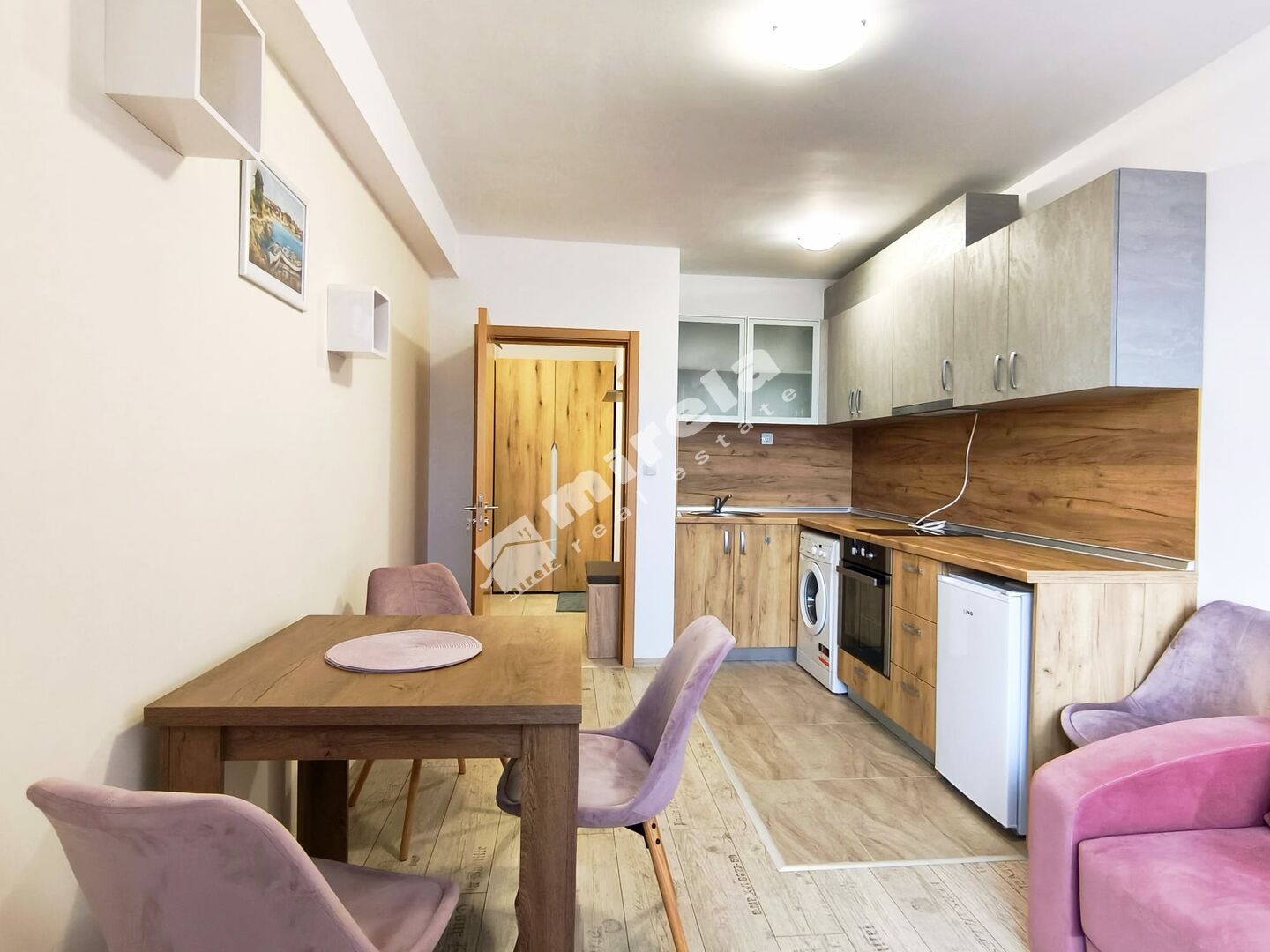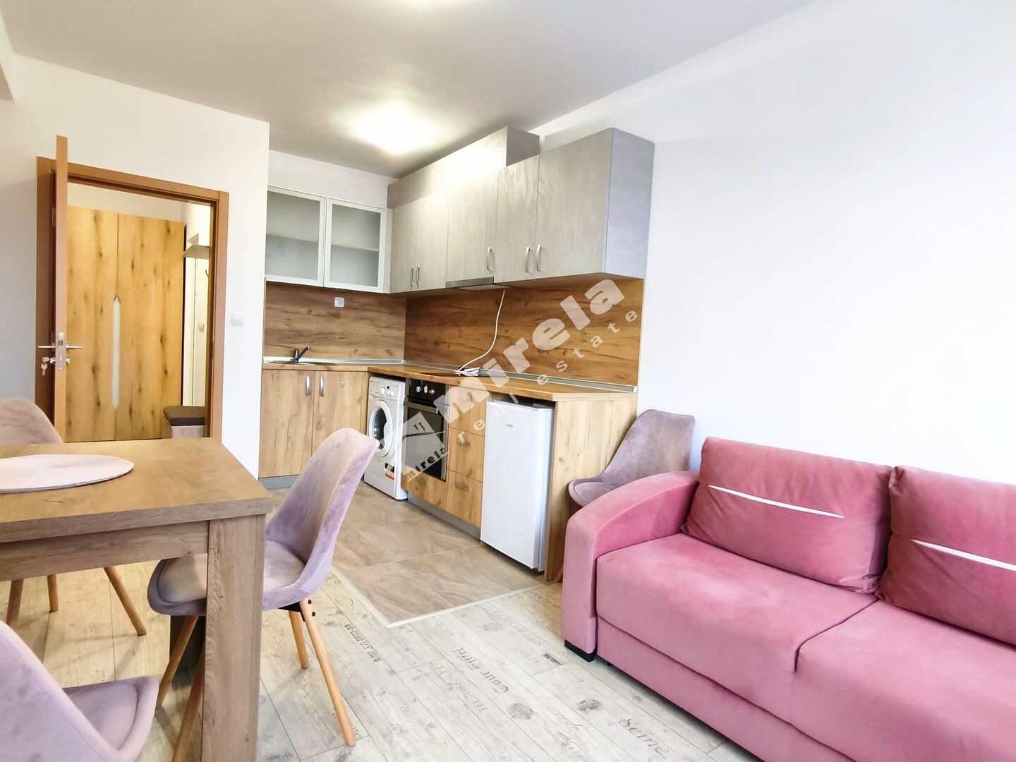 Състои се от всекидневна с кухня, спалня, баня с тоалетна, балкон. Намира се на втори етаж. Продава се обзаведен.