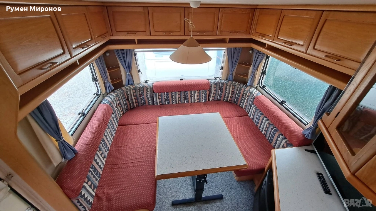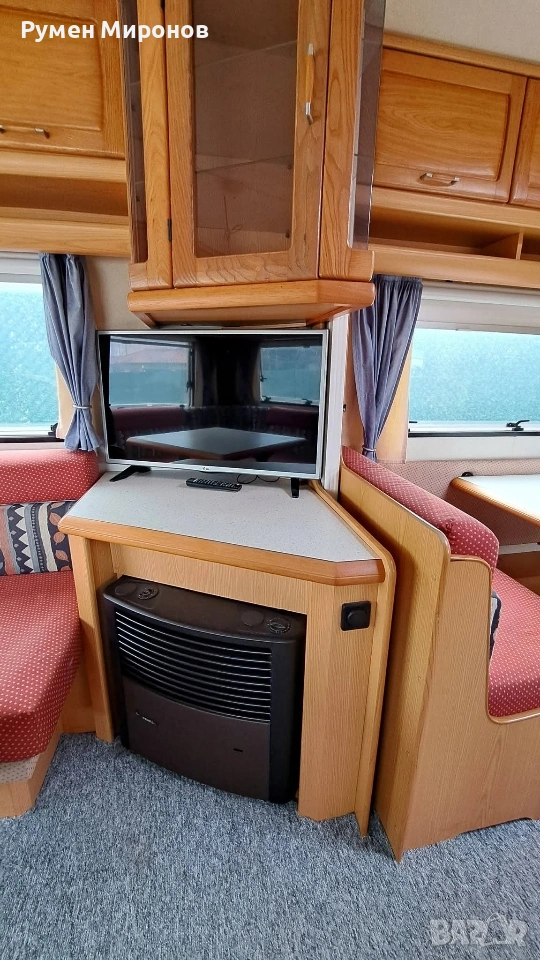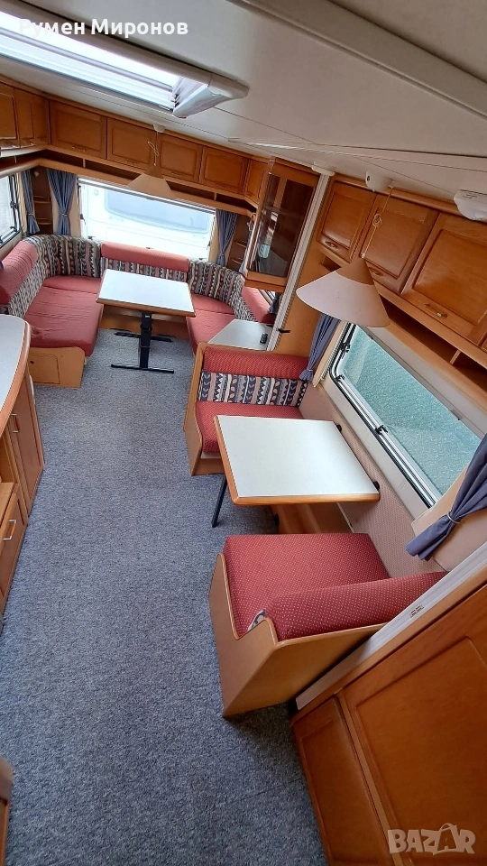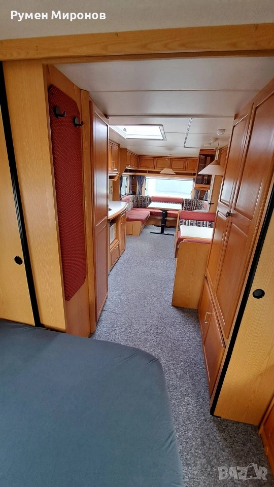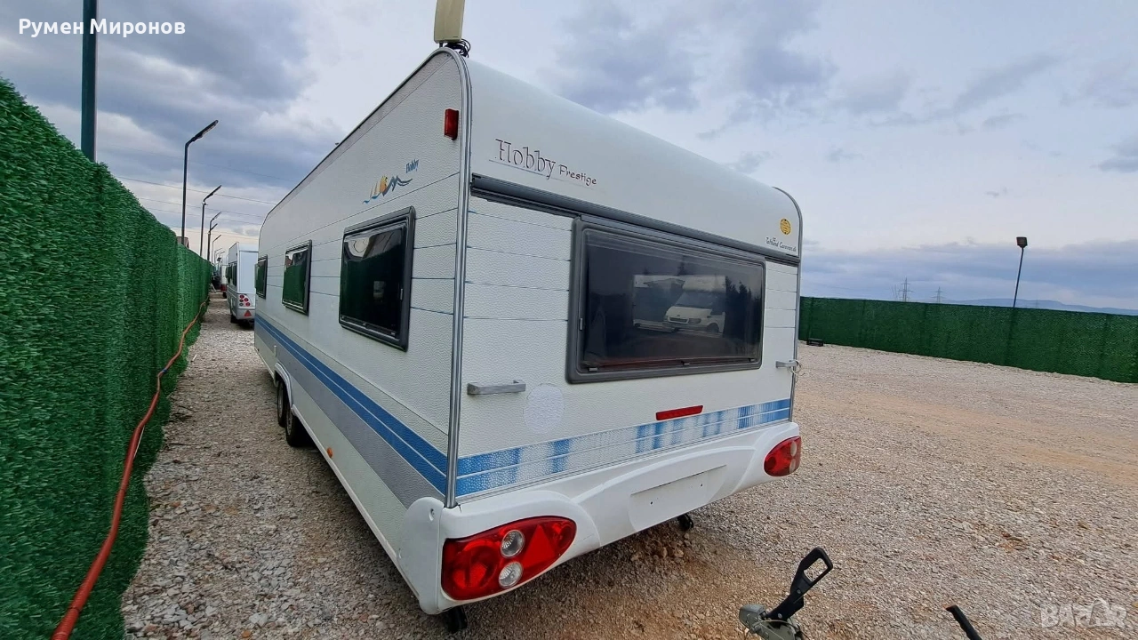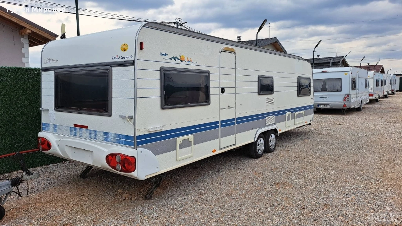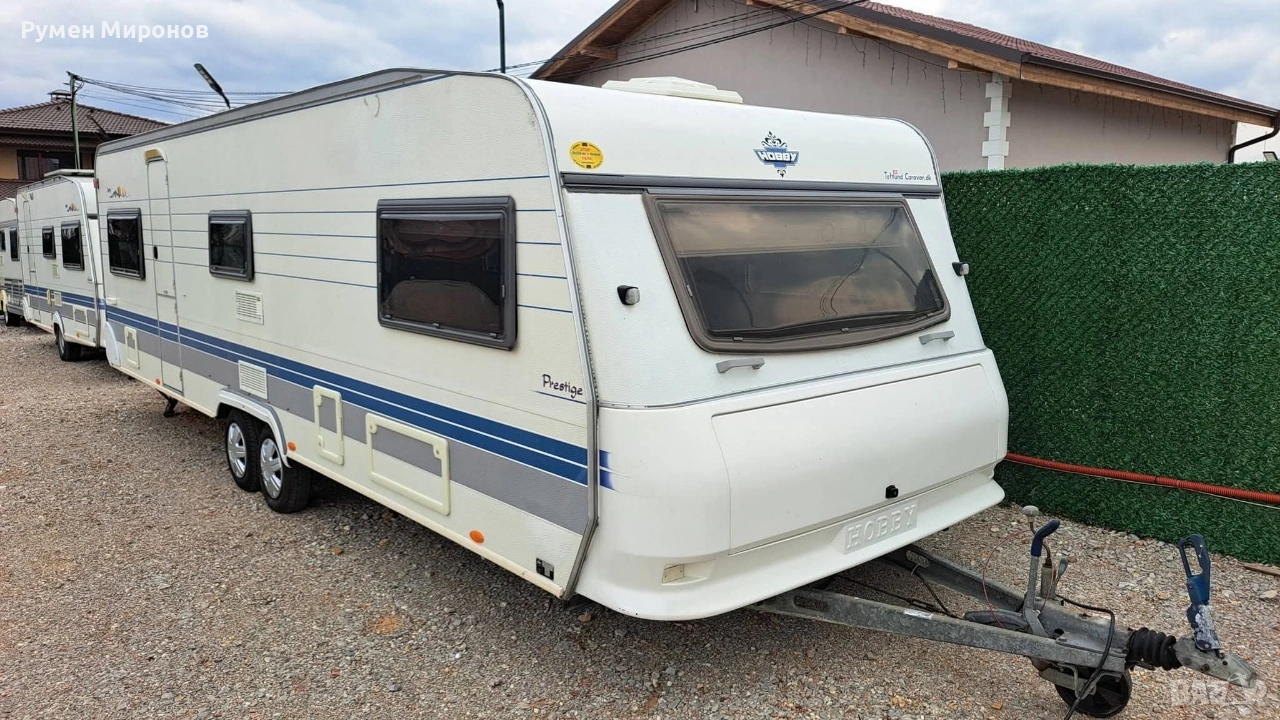 Здравейте колеги, продавам пет местна каравана Хоби, произведена на 31.12.2002 година, нов внос от Дания, с документи за регистрация. Караваната тежи празна 1675 килограма и натоварена 2000 килограма, с дължина 7.60 метра. Разположение: в ляво от вратата, П-образен салон, който става на спалня, с място за багаж под диванчетата, където се намира и съда за чиста вода. До него ъглов шкаф с витрина, място за телевизор и газова отоплителна печка с обдухване на цялата каравана. От дясно на вратата кухненски бокс с течаща топла и студена вода, хладилник с голяма камера, микровълнова фурна и абсорбатор. До бокса, баня с топла вода (няма душ) и химическа тоалетна с обслужване от вън. На пода душ-корито. Отсреща, сепаре за двама човека, което става на спалня за един човек, с място за багаж под нея. До него голям гардероб. В дъното, голяма френска спалня, с място за багаж под нея. Там се намира и електрическия бойлер, който е чисто нов. Тоалетка с огледоло. Караваната разполага с двоен форселт по дължина на цялата каравана, с малки забележки, и се нуждае от изпиране. - Електрическо подово отопление на цялата каравана. - Голяма и две малки капандури. - Осем отваряеми прозореца със щори и комарници. - Голяма газова бутилка. Караваната се намира в София, район Божурище. Цена 10500 евро. Възможен бартер за друга каравана. Огледи по всяко време след уговорка. Транспорт в страната и чужбина след договорка. 0878 266 554