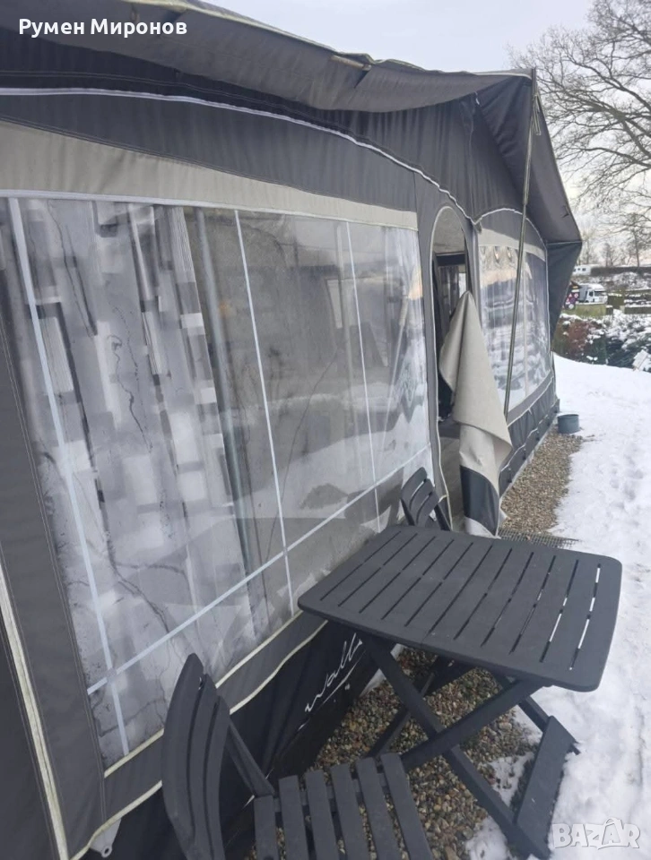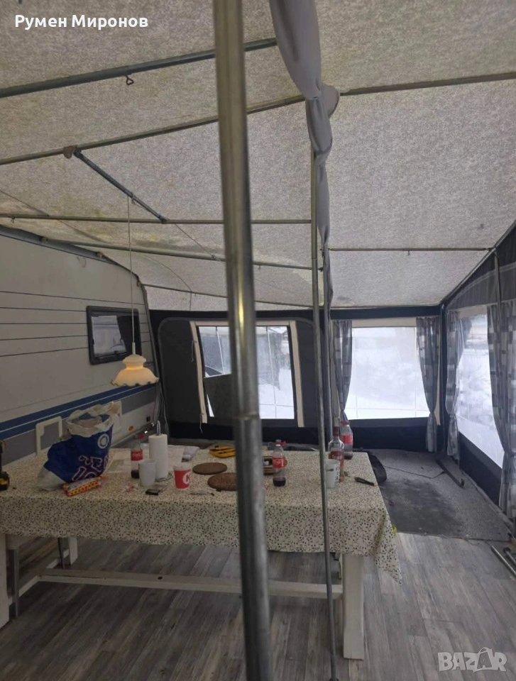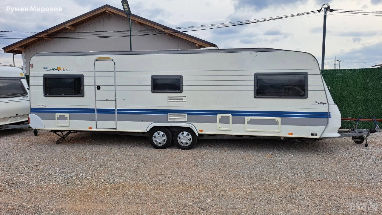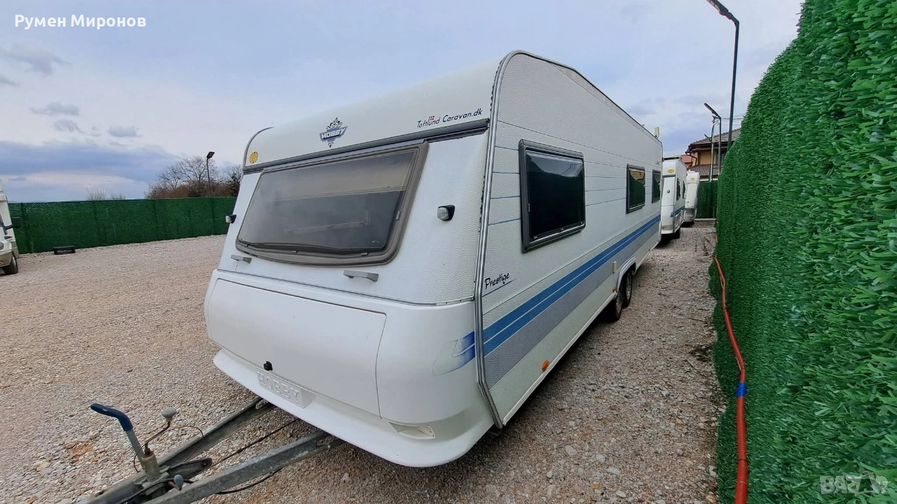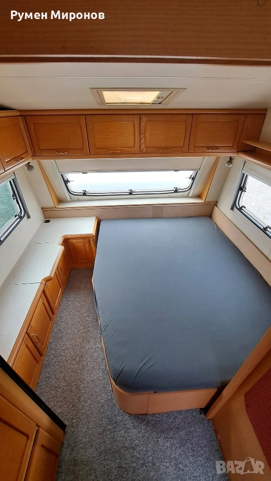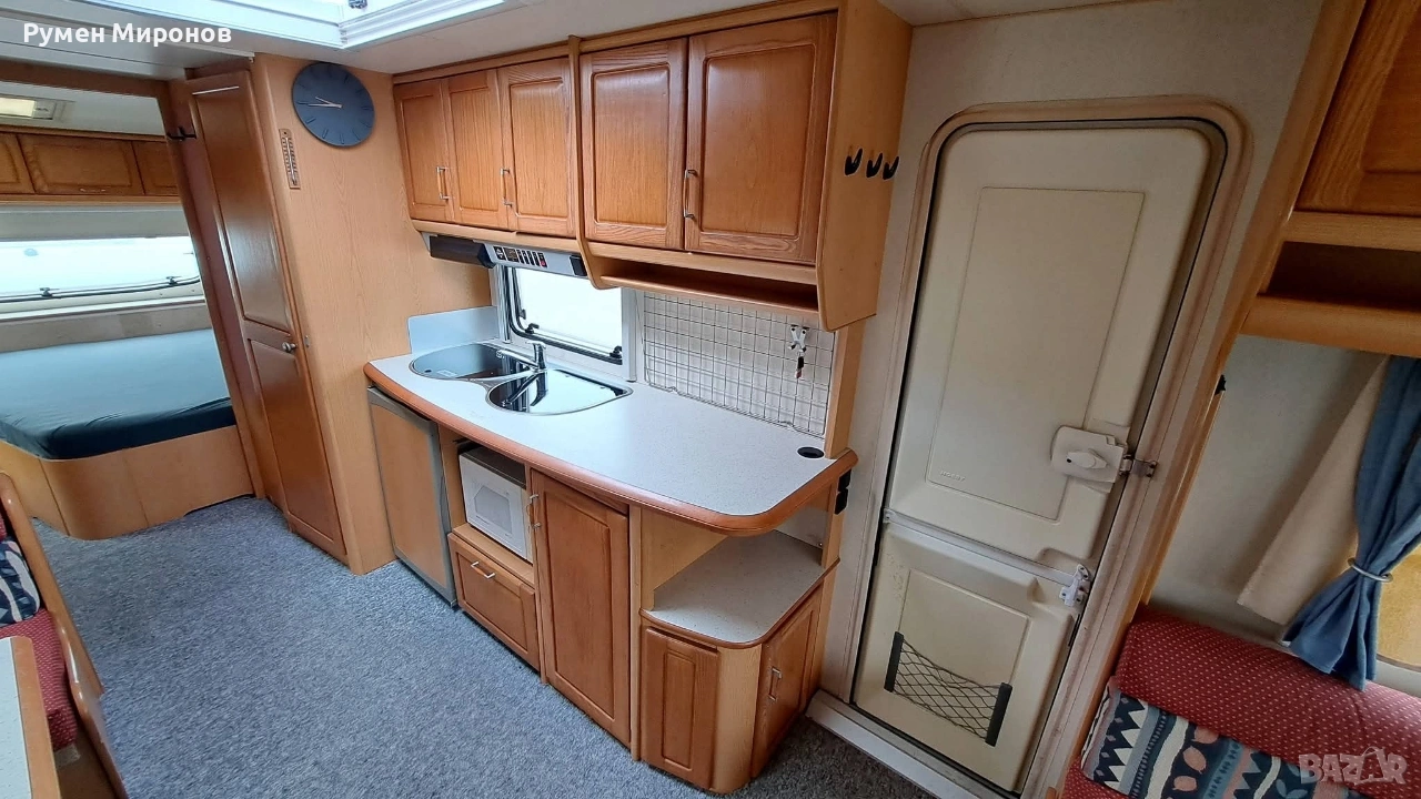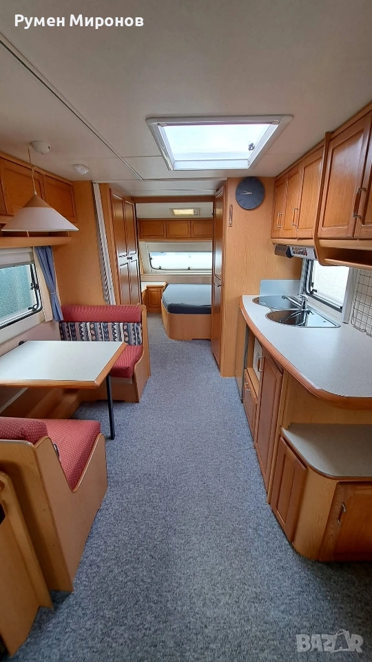 Здравейте колеги, продавам пет местна каравана Хоби, произведена на 31.12.2002 година, нов внос от Дания, с документи за регистрация. Караваната тежи празна 1675 килограма и натоварена 2000 килограма, с дължина 7.60 метра. Разположение: в ляво от вратата, П-образен салон, който става на спалня, с място за багаж под диванчетата, където се намира и съда за чиста вода. До него ъглов шкаф с витрина, място за телевизор и газова отоплителна печка с обдухване на цялата каравана. От дясно на вратата кухненски бокс с течаща топла и студена вода, хладилник с голяма камера, микровълнова фурна и абсорбатор. До бокса, баня с топла вода (няма душ) и химическа тоалетна с обслужване от вън. На пода душ-корито. Отсреща, сепаре за двама човека, което става на спалня за един човек, с място за багаж под нея. До него голям гардероб. В дъното, голяма френска спалня, с място за багаж под нея. Там се намира и електрическия бойлер, който е чисто нов. Тоалетка с огледоло. Караваната разполага с двоен форселт по дължина на цялата каравана, с малки забележки, и се нуждае от изпиране. - Електрическо подово отопление на цялата каравана. - Голяма и две малки капандури. - Осем отваряеми прозореца със щори и комарници. - Голяма газова бутилка. Караваната се намира в София, район Божурище. Цена 10500 евро. Възможен бартер за друга каравана. Огледи по всяко време след уговорка. Транспорт в страната и чужбина след договорка. 0878 266 554