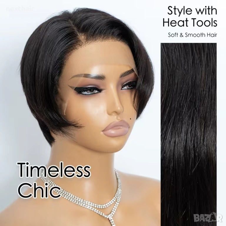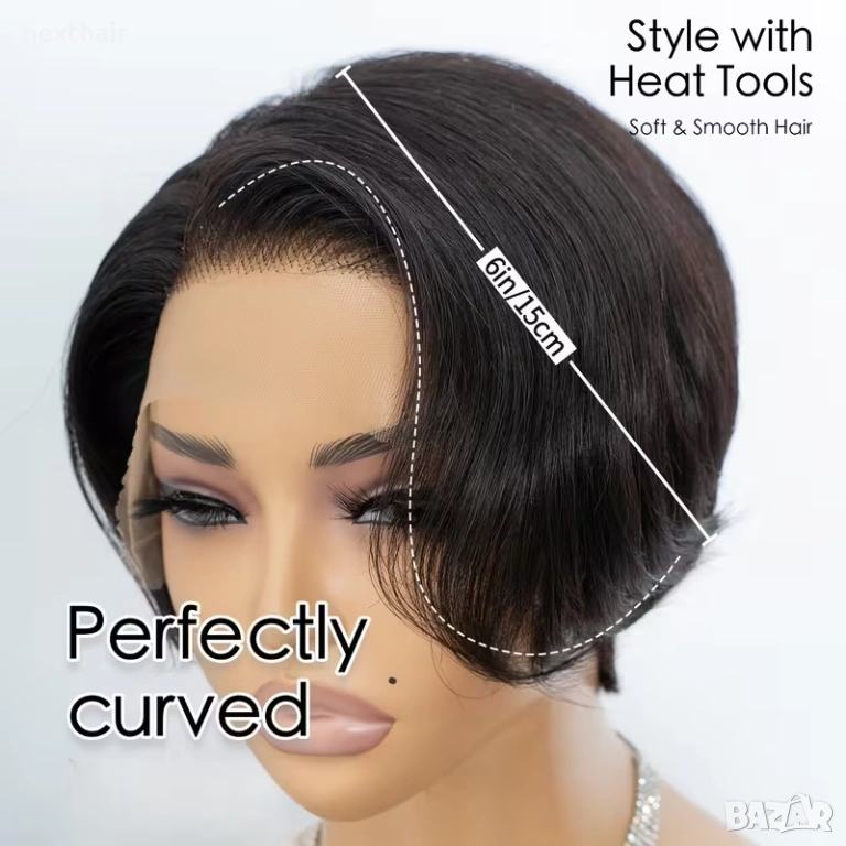 Стилна къса черна перука със скосена боб форма и дантелена зона 13x4, която позволява естествено изглеждаща линия на косата и различни варианти на пътя. Моделът е с модерно скосено подстригване - по-къса отзад и по-дълга отпред, което придава елегантен и подчертан силует.