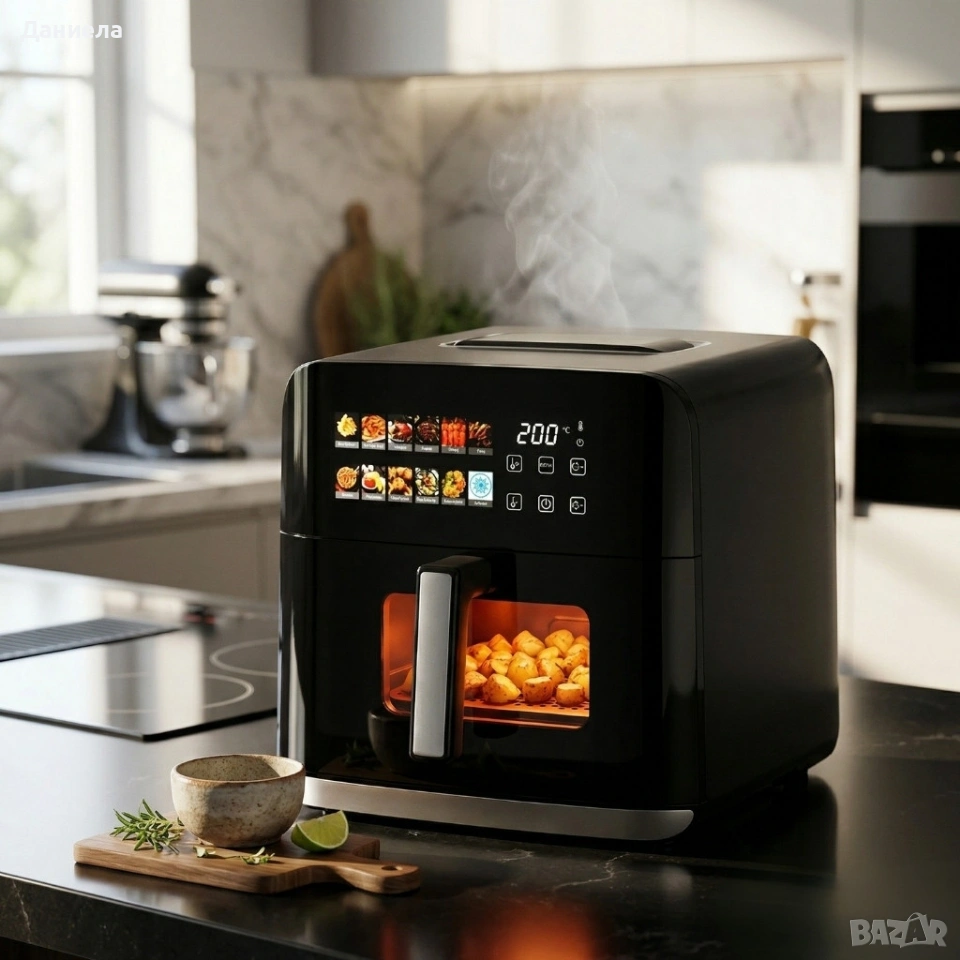 Мощност: 1800 W (1500 W + 300 W) Напрежение: 220–240 V~, 50–60 Hz Вместимост на кошницата: 8.0 л с незалепващо тефлоново покритие Материал на камерата: метална камера с неръждаеми нагревателни елементи SUS304 Температурен диапазон: 80°C–200°C Таймер: до 60 минути Функции: 12 предварително зададени програми, LED дисплей, прозрачен прозорец, защита от прегряване, противоплъзгащи крачета